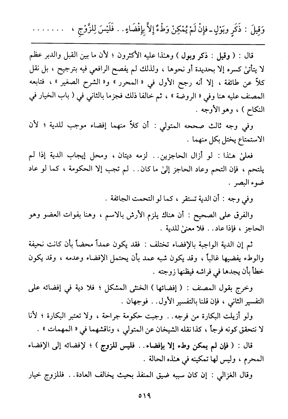 وَقَيْل: ذِكْر وَبُول - فَإِنَّ لِمَ يُمَكِّن وَطْء إِلّا بِإِفْضاء .... فَلَيْسَ لِلزَوْج،