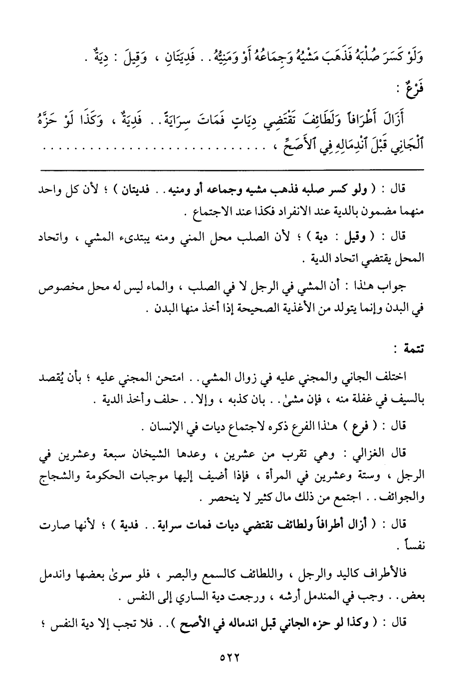 قال الغزالى: وهى تقرب من عشرين، وعدها الشيخان سبعه وعشرين فى رجل، وستة وعشرين فى المرأه، فأذا أضيف إليها موجبات الحكومه والشجاج والجوائف .. اجتمع من ذلك مال كثيرلا ينحصر.