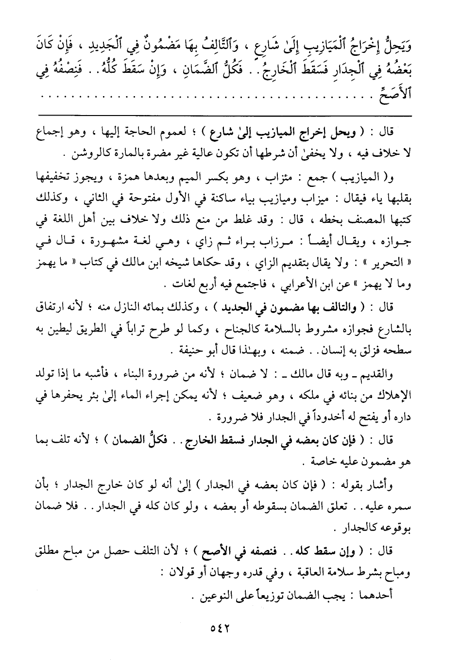 قال: (ويحل إخراج الميازيب إلى شارع)؛ لعموم الحاجة إليها، وهو إجماع لا خلاف فيه، ولا يخفى أن شرطها أن تكون عالية غير مضرة بالمارة كالروشن. و (الميازيب) جمع: مئزاب، وهو بكسر الميم وبعدها همزة، ويجوز تخفيفها بقلبها ياء فيقال: مزاب وميازيب بياء ساكنة في الأول مفتوحة في الثانى، وكذلك كتبها المصنف بخطه، قال: وقد غلط من منع ذلك ولا خلاف بين أهل اللغة في جوازه، ويقال أيضًا: مرزاب براء ثم زاي، وهى لغة مشهورة، قال في) التحرير): ولا يقال بتقديم الزاي، وقد حكاها شيخه ابن مالك في كتاب (ما يهمز وما لا يهمز) عن ابن الأعرابى، فاجتمع فيه أربع لغات.