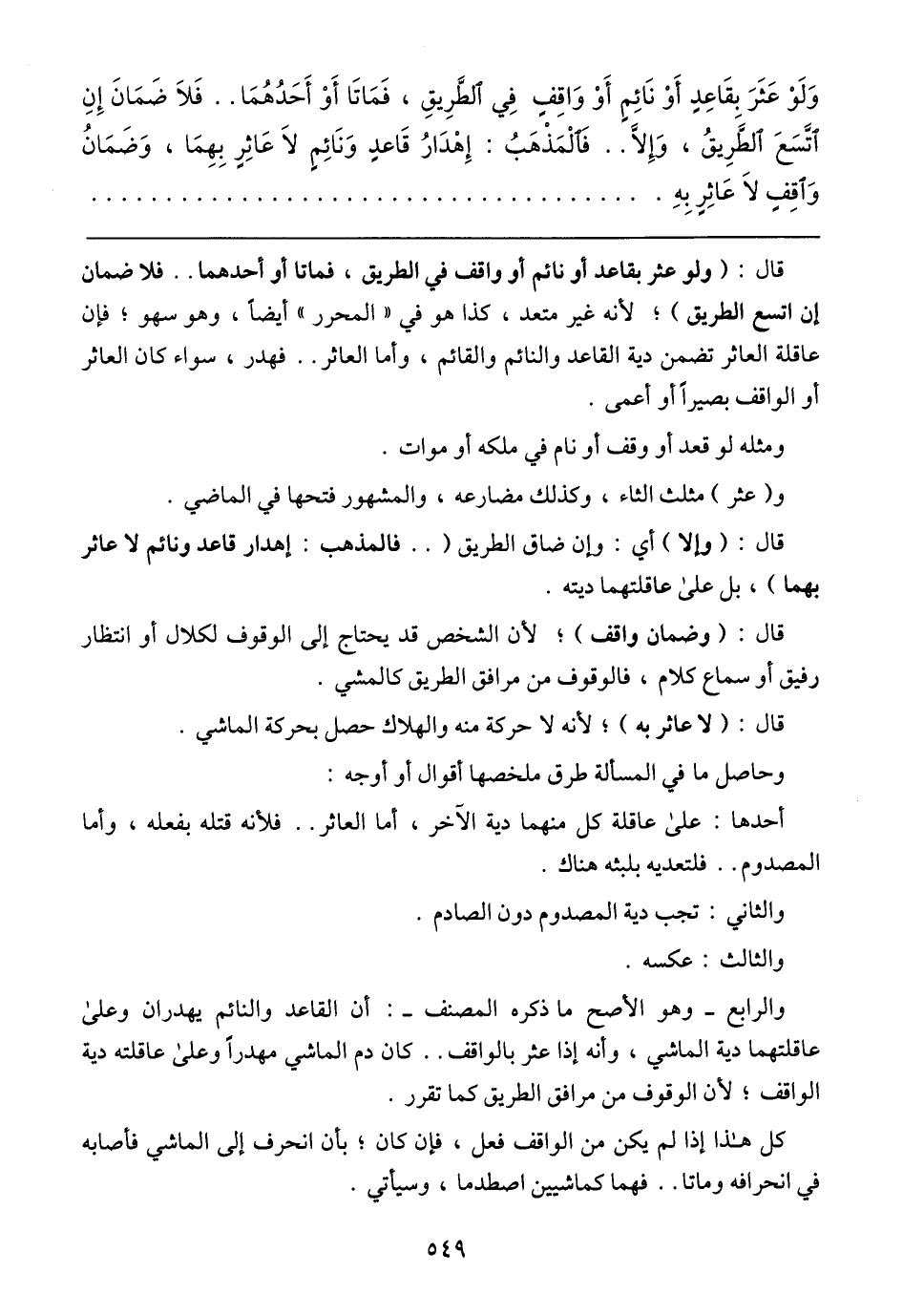 وَلَوْ عَثَرَ بِقَاعِدِ أَوْ نَائِمِ أَوْ وَاِقِفِ فِي اٌلطَّرِيقِ، فَمَاتَا أَوْ أَحَدُهُمَا .. فَلاَ ضَمَانَ إِنِ اٌتَّسَعَ اٌلطَّرِيقُ، وَإِلاَّ .. فَاٌلْمَذْهَبُ: إِهْدَارُ وَنَائِم لاَ عَاثِرِ بِهِمَا، وَضَمَانُ وَاٌقِفِ لاَ عَاثِرِ بِهِ