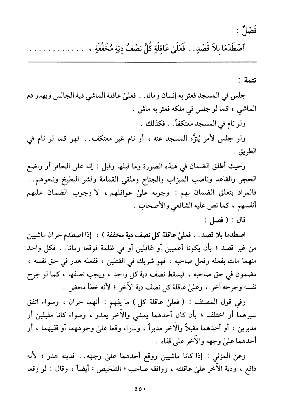 اصطدما بلا قصد .. فعلى عاقلة كل نصف دية مخففة)، إذا اصطدم حران ماشيين من غير قصد؛ بان يكونا أعميين أو غافلين أو في ظلمة فوقعا وماتا .. فكل واحد منهما مات بفعله وفعل صاحبه، فهو شريك في القتلين، ففعله هدر في حق نفسه، مضمون في حق صاحبه، فيسقط نصف ديه كل واحد، ويجب نصفها، كما لو جرح نفسه وجرحه آخر، وعلى عاقلة كل نصف دية الآخر؛ لأنه خطا مخص.