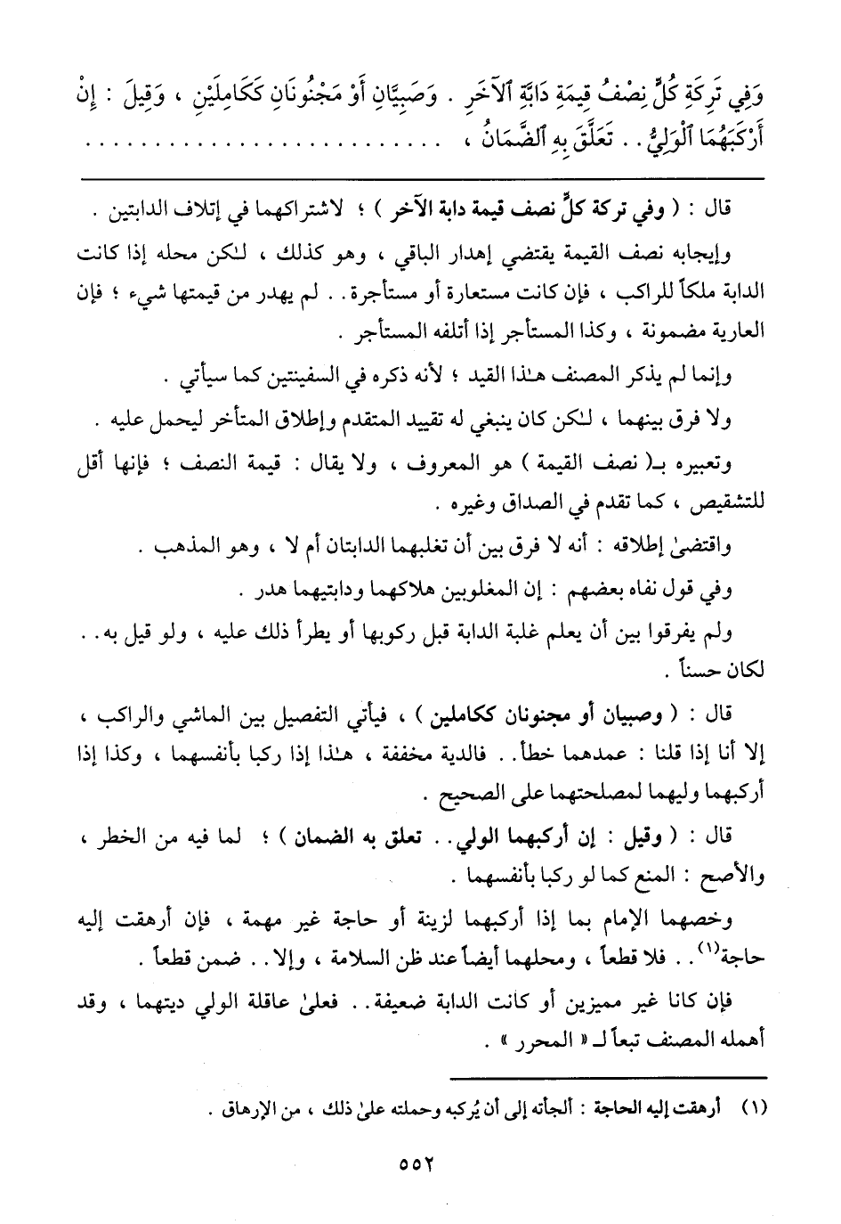 قال: (وصبيان أو مجنونان ككاملين)، فيأتي التفصيل بين الماشي والراكب، الا أنا اذا قلنا: عمدهما خطأ .. فالدية مخففة، هذا اذا ركبا بأنفسهما، وكذا اذا اركبهما وليهما لمصلحتهما على الصحيح.