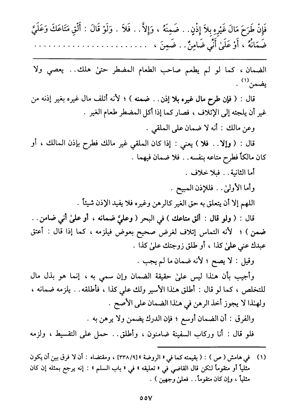 فَإِنْ طَرَحَ مَالَ غَيْرِهِ بِلاَ إِذْنِ .. ضَمِنَهُ، وَاِلاَّ .. فَلاَ. وَلَوْ قَالَ: أَلْقِ مَتَاعَكَ وَعَلَيَّ ضَمَانُهُ، أَوْ عَلَى أَنَّي ضَامِنٌ .. ضَمِنَ،