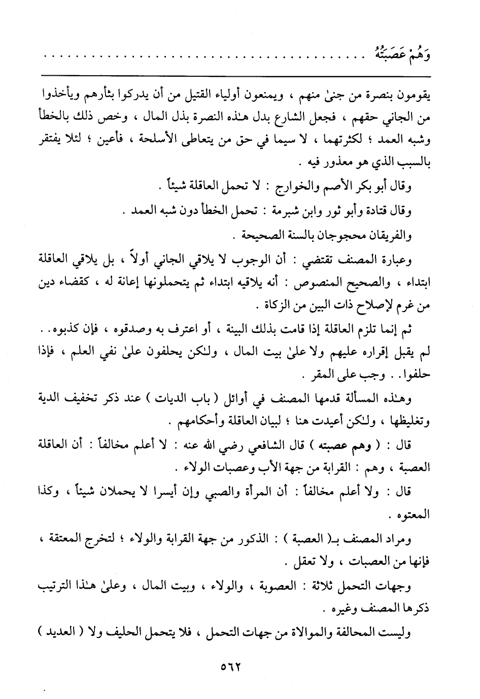 يقومون بنصرة من جنى منهم، ويمنعون أولياء القتيل من أن يدركوا بثأرهم وياخذوا من الجانى حقهم، فجعل الشارع بدل هذه النصرة بذل الماص، وخص ذلك بالخطا وشبه العمد؛ لكثرتهما، لا سيما في حق من يتعاطى الأسلحة، فأعين؛ لئلا يفتقر بالسبب الذي هو معذور ليه.