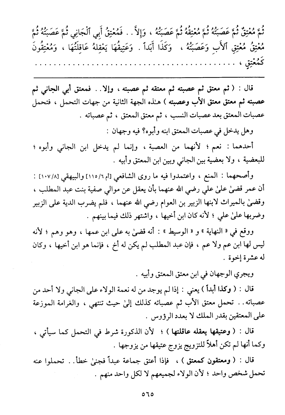 ثُمَّ مُعْتِقٌ ثُمَّ عَصَبَتُهُ ثُمَّ مُعْتِقُهُ ثُمَّ عَصَبَتُهُ، وَإِلاَّ .. فَمُعْتِقُ أَبَي اٌلْجَانِي ثُمَّ عَصَبَتُهُ ثُمَّ مُعْتِقُ مُعْتِقِ اٌلأَبِ وَعَصَبَتُهُ، وَكَذَا أَبَداَ. وَعَتِيقُهَا يَعْقِلهُ عَاقِلَتُهَا، وَمُعْتِقُونَ كَمُعْتِقِ،