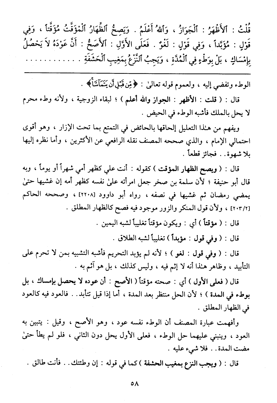 قُلْتُ: الْأَظْهَرُ: الجَوَازُ, وَاللهُ أَعْلَمُ. وَيَصِحُّ الظِّهَارُ المُؤَقَّتُ مُؤَقَّتًا , وَفيِ قَوْلٍ: مُؤَبَّدًا, وَفيِ قَوْلٍ: لَغْوٌ. فَعَلَى الْأَوَّلِ: أَلأَصَّحُ: أَنَّ عَوْدَهُ لَا يَحْصُلُ بِإِمْسَاكٍ, بَلْ بِوَطْءٍ فِي المُدَّةِ، وَيَجِبُ النَّزْعُ بِمَغِيبِ الحَشَفَةِ