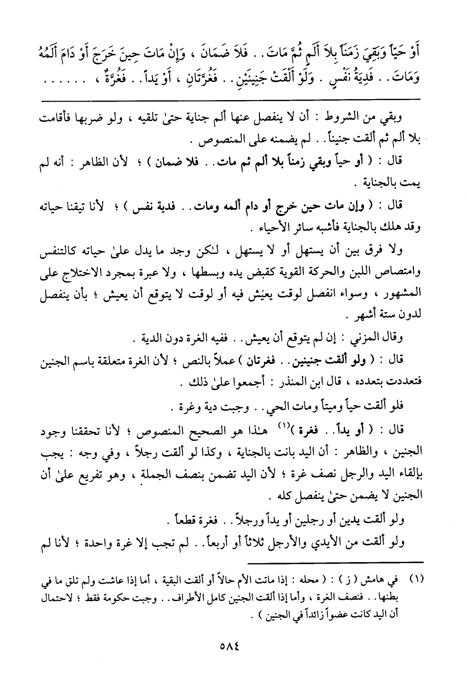 أَوْ حَيًّا وَبَقِىَ زَمَنًا بِلَا أَلَمٍ ثُمَّ مَاتَ .. فَلَا ضَمَانَ، وَإِنْ مَاتَ حِينَ خَرَجَ أَوْ دَامَ أَلَمُهُ وَمَاتَ .. فَدِيَةُ نَفْسٍ وَلَوْ أَلْقَتْ جَنِينَيْنِ فَغُرَّتَانِ، أَوْ يَدًا فَغُرَّةٌ،