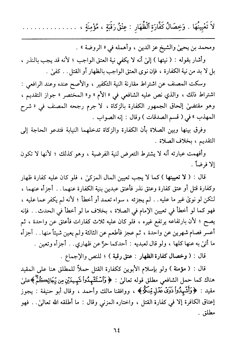 قال: (مؤمنة) ولو بإسلام الأبوين ككفارة القتل حملًا للمطلق هنا على المقيد هناك كما حمل الشافعي مطلق قوله تعالى: {وَاسْتَشْهِدُوا شَهِيدَيْنِ مِنْ رِجَالِكُمْ} على مقيد: {وَأَشْهِدُوا ذَوَيْ عَدْلٍ مِنْكُمْ}، ووافقنا مالك وأحمد، وقال أبو حنيفة: يجوز إعتاق الكافرة إلا في كفارة القتل، واختاره المزني وقال: ما أطلقه الله تعالى .. فهو مطلق.
