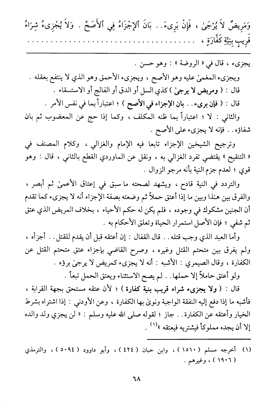 وَمَرِيضٌ لَا يُرْجَى، فَإِنْ بَرَئَ .. بَانَ الْإِجْزَاءُ فِي الْأَصَحِّ. وَلَا يُجْزِئُ شِرَاءُ قَرِيبٍ بِنِيَّةِ كَفَّارَةٍ