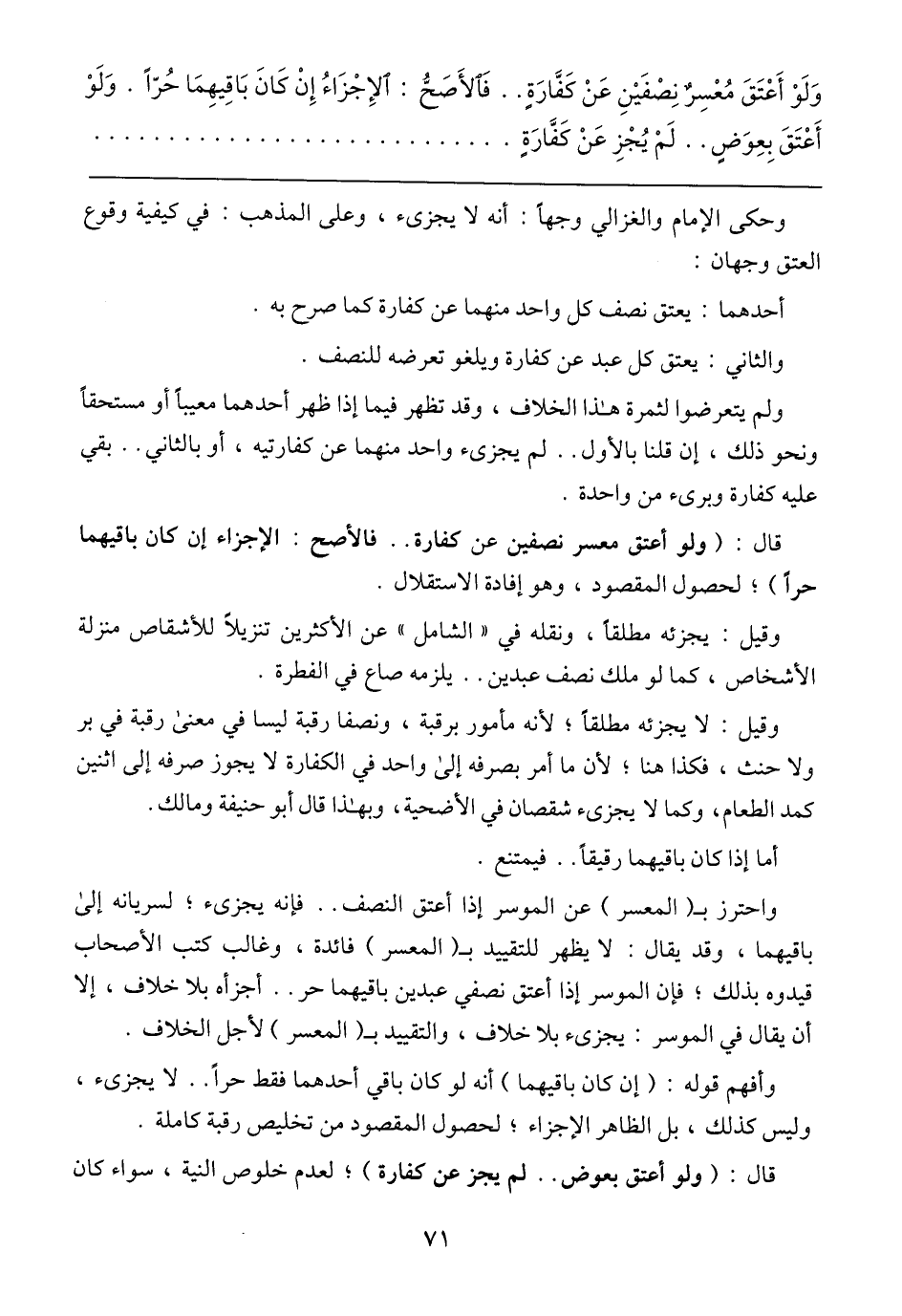 واحترز ب (المعسر) عن الموسر إذا أعتق النصف .. فإنه يجزئ؛ لسريانه إلى باقيهما، وقد يقال: لا يظهر للتقييد ب (المعسر) فائدة، وغالب كتب الأصحاب قيدوه بذلك؛ فإن الموسر إذا أعتق نصفي عبدين باقيهما حر .. أجزأه بلا خلاف، إلا أن يقال في الموسر: يجزئ بلا خلاف، والتقييد ب (المعسر) لأجل الخلاف.