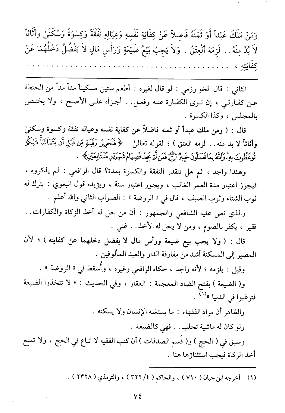 وَمَنْ مَلَكَ عَبْدًا أَوْ ثَمَنَهُ فَاضِلًا عَنْ كِفَايَةِ نَفْسِهِ وَعِيَالِهِ نَفَقَةً وَكِسْوَةً وَسُكْنَى وَأَثَاثًا لَا بُدَّ مِنْه .. لَزِمَهُ الْعِتْقُ. وَلَا يَجِبُ بَيْعُ ضَيْعَةٍ وَرَاسِ مَالٍ لَا يَفْضُلُ دَخْلُهُمَا عَنْ كِفَايَتِه،