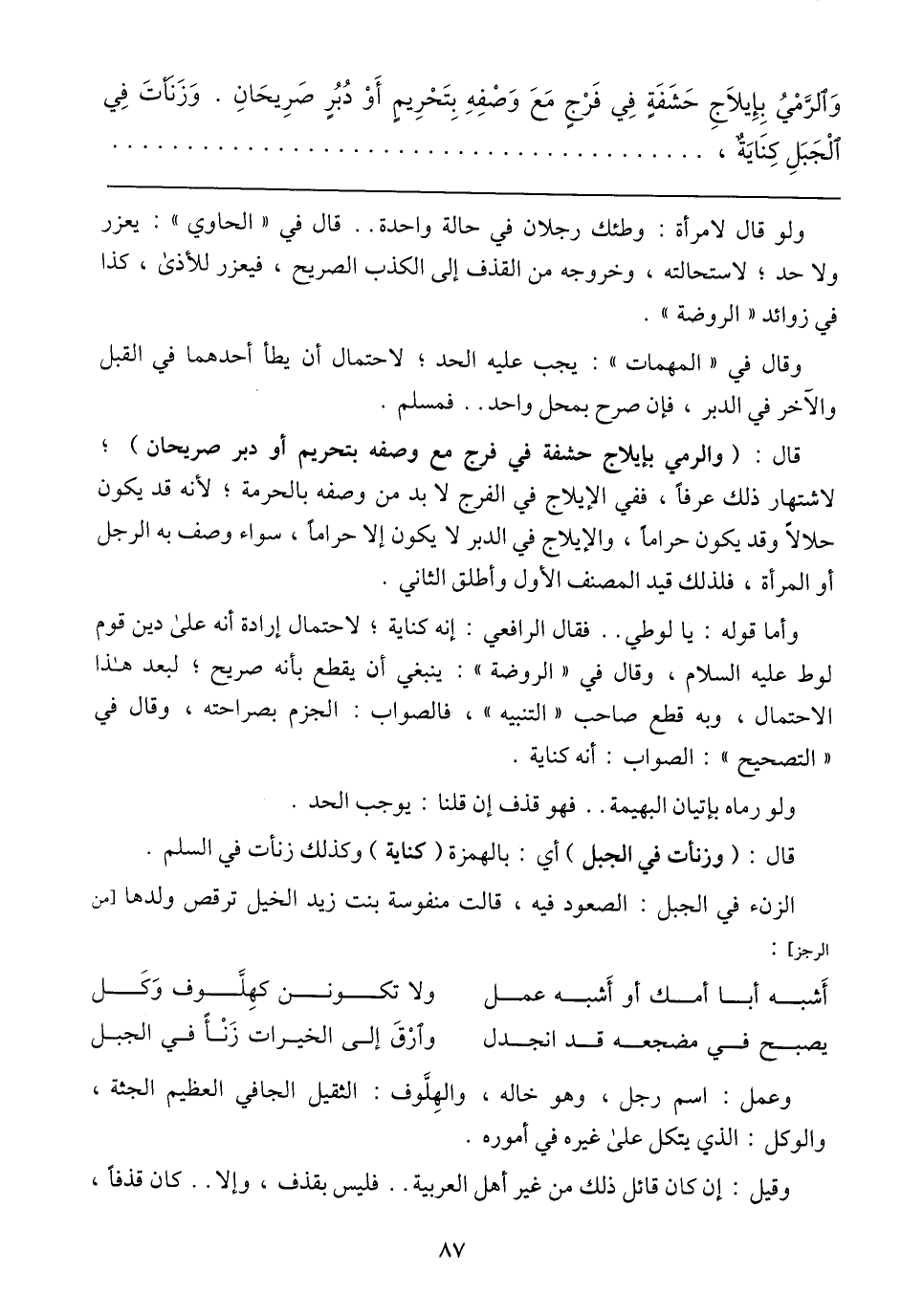 وَالرَّمْيُ بِإِيلاَجِ حَشَفَةٍ فِي فَرْجٍ مَعَ وَصْفِهِ بِتَحْرِيمٍ أَوْ دُبُرٍ صَرِيحَانِ. وَزَنَأتَ فِي الْجَبَلِ كِنَايَةٌ،