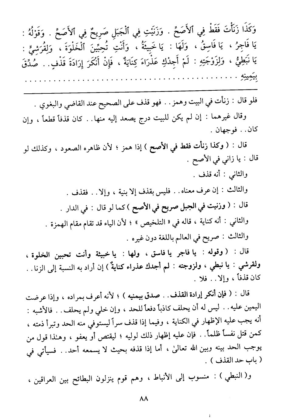 وَكَذَا زَنَأتَ فَقَطْ فِي الأَصَحِّ. وَزَنَيْتِ فِي الْجَبَلِ صَرِيحٌ فِي الأَصَحِّ. وَقَوْلُهُ: يَا فَاجِرُ، يَا فَاسِقُ، وَلَهَا: يَا خَبِيثَةُ، وَأَنْتِ تُحِبِّينَ الْخَلْوَةَ، وَلِقُرَشِيِّ: يَا نَبَطِيُّ وَلِزَوْجَتِهِ: لَمْ أَجِدْكِ عَذْرَاءَ كِنَايَةٌ، فَإِنْ أَنْكَرَ إِرَادَةَ قَذْفٍ .. صُدِّقَ بِيَمِيِنِه