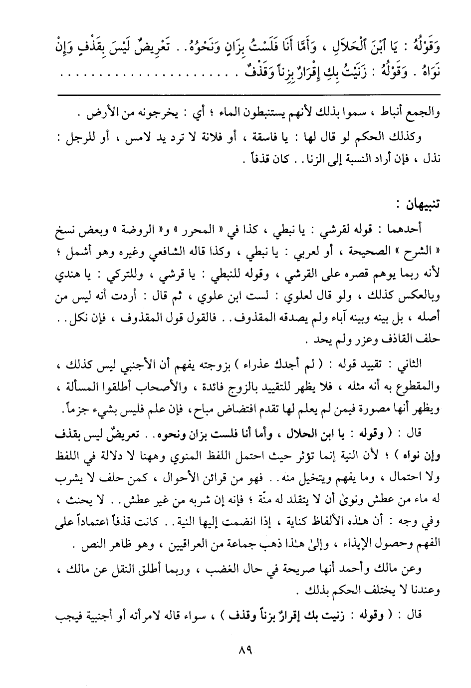 وَقَوْلُهُ: يَا ابْنَ الْحَلاَلِ، وَأَمَّا أَنَا فَلَسْتُ بِزَانٍ وَنَحْوُهُ .. تَعْرِيضٌ لَيْسَ بِقَذْفٍ وَإنْ نَوَاهُ. وَقَوْلُهُ: زَنَيْتُ بِكِ إِقْرَارٌ بِزِنًا وَقَذْفٌ