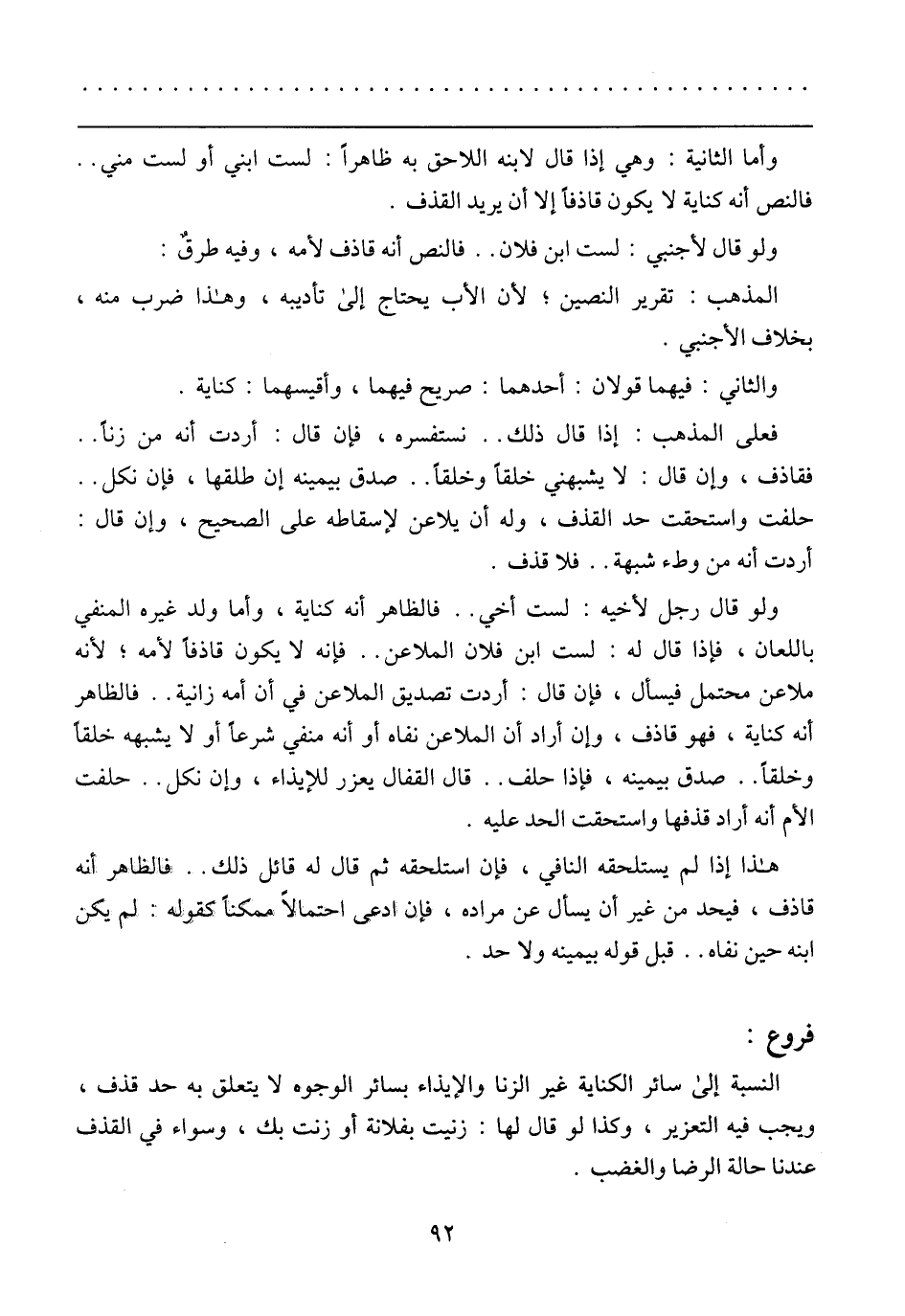 النسبة إلى سائر الكناية غير الزنا والإيذاء بسائر الوجوه لا يتعلق، به حد قذف، ويجب فيه التعزير، وكذا لو قال لها: زنيت بفلانة أو زنت بك، وسواء في القذف عندنا حالة الرضا والغضب.