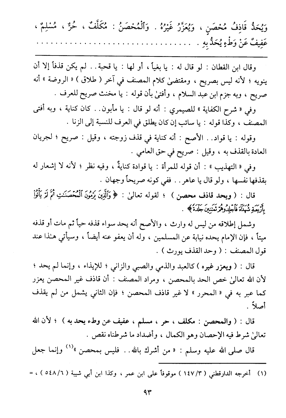 وَيُحَدُ قَاِذفُ مُحْصَنِ، وَيُعَزَّرُ غَيْرُهُ. وَالْمُحْصَنُ: مُكَلَّفٌ، حُرٌ، مُسْلِمٌ، عَفِيفٌ عَنْ وَطْءٍ يُحَدُ بِهِ