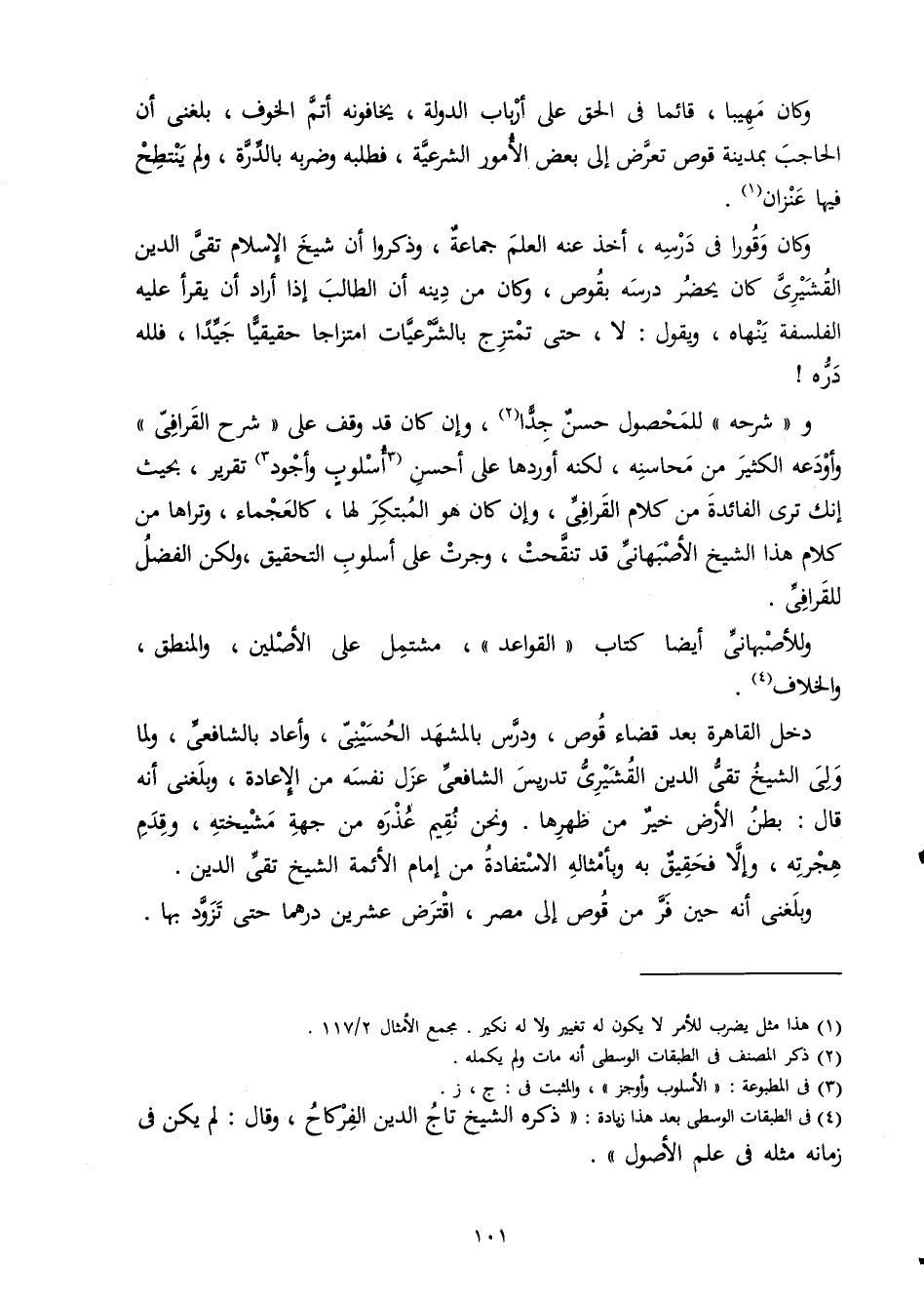 وشَرحه للمحصول حسن جدا وَإِن كَانَ قد وقف على شرح الْقَرَافِيّ وأودعه الْكثير من محاسنه لكنه أوردهَا على أحسن أسلوب وأجود تَقْرِير بِحَيْثُ إِنَّك ترى الْفَائِدَة من كَلَام الْقَرَافِيّ وَإِن كَانَ هُوَ المبتكر لَهَا كالعجماء وتراها من كَلَام هَذَا الشَّيْخ الْأَصْبَهَانِيّ قد تنقحت وَجَرت على أسلوب التَّحْقِيق وَلَكِن الْفضل للقرافي