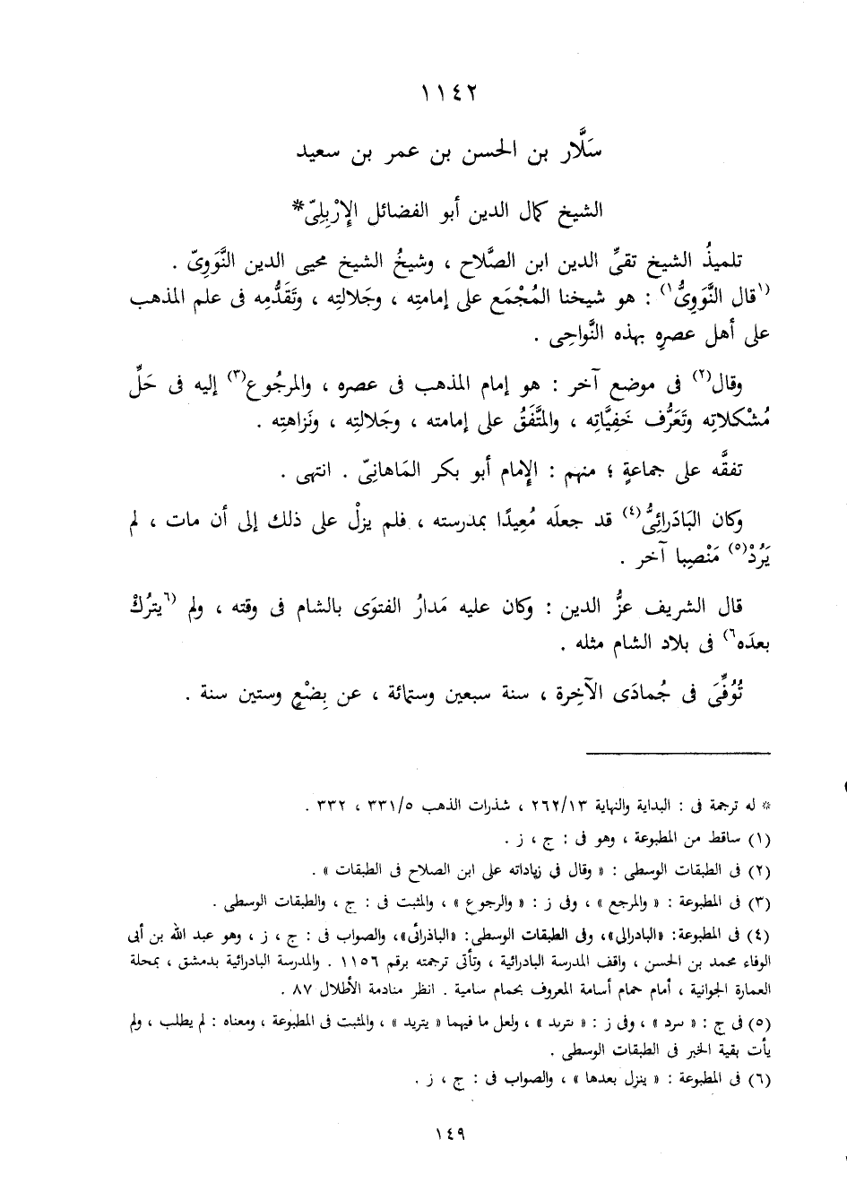 1142 - سلار بن الْحسن بن عمر بن سعيد الشَّيْخ كَمَال الدّين أَبُو الْفَضَائِل الإربلي