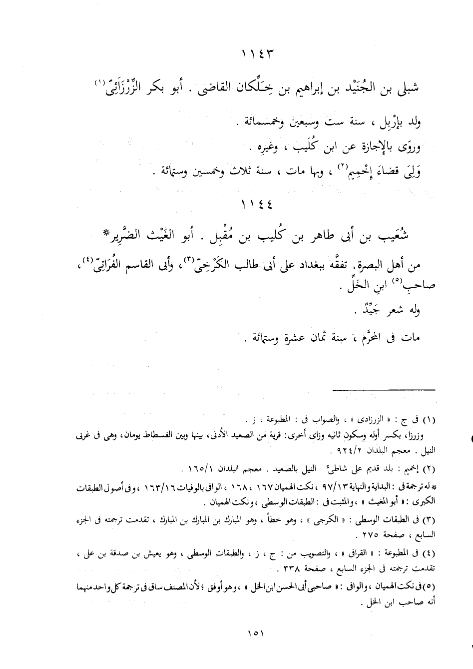 1143 - شبلي بن الْجُنَيْد بن إِبْرَاهِيم بن خلكان القَاضِي أَبُو بكر الزرزائي