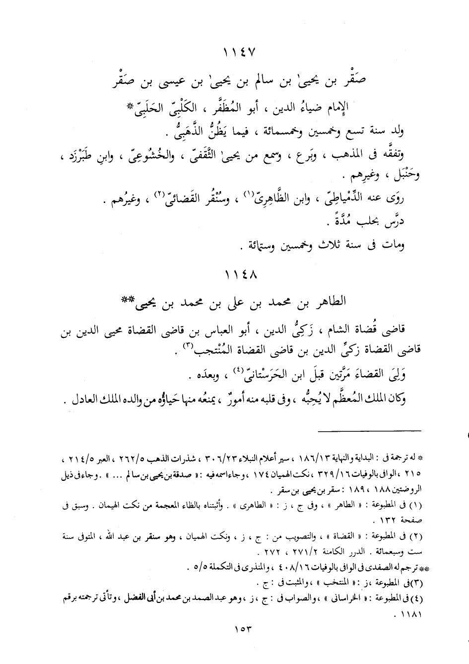 1147 - صقر بن يحيى بن سَالم بن يحيى بن عِيسَى بن صقر الإِمَام ضِيَاء الدّين أَبُو المظفر الْكَلْبِيّ الْحلَبِي