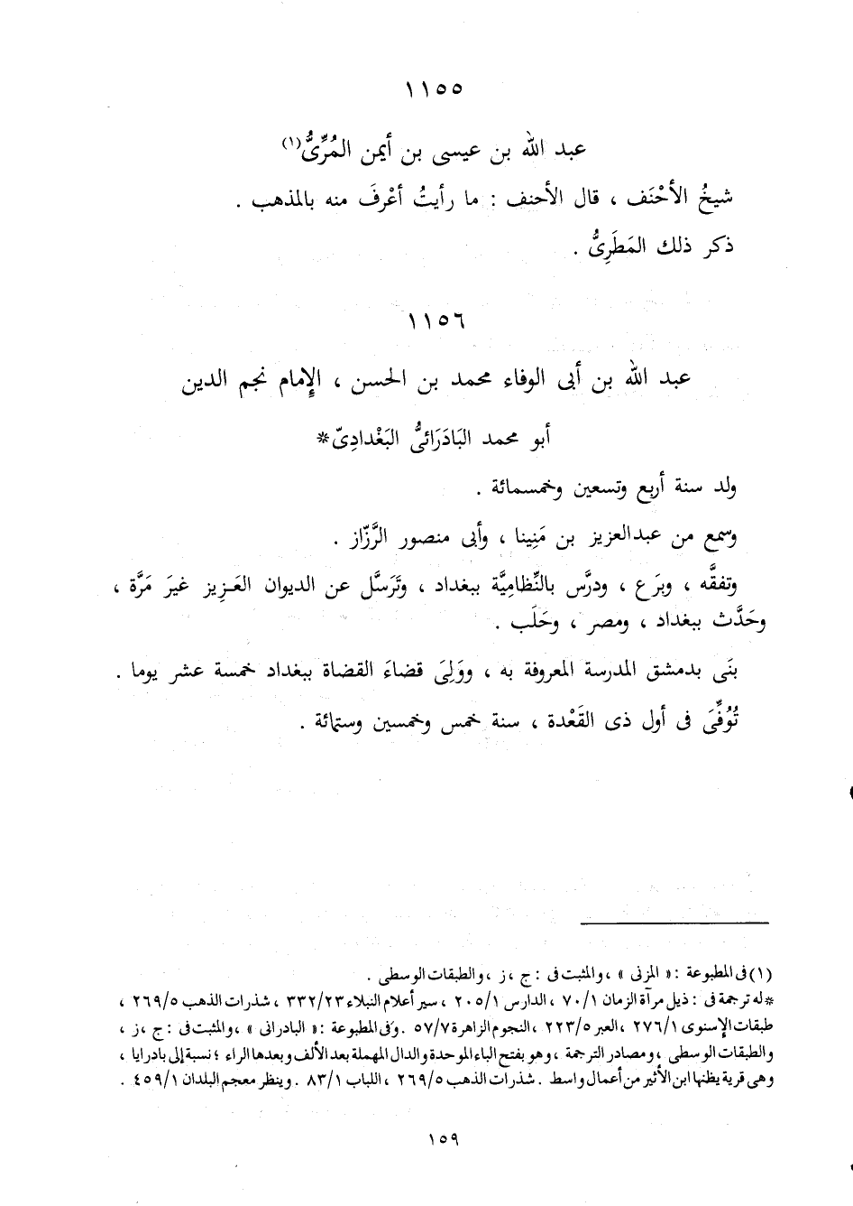 1156 - عبد الله بن أبي الْوَفَاء مُحَمَّد بن الْحسن الإِمَام نجم الدّين أَبُو مُحَمَّد البادرائي الْبَغْدَادِيّ