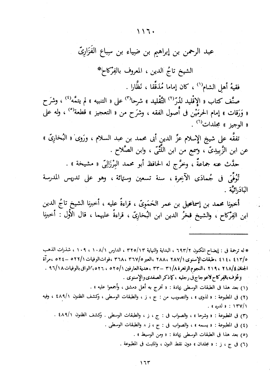 1160 - عبد الرَّحْمَن بن إِبْرَاهِيم بن ضِيَاء بن سِبَاع الْفَزارِيّ الشَّيْخ تَاج الدّين الْمَعْرُوف بالفركاح