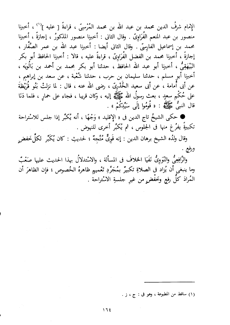 الإِمَام شرف الدّين مُحَمَّد بن عبد الله بن مُحَمَّد المرسي قِرَاءَة عَلَيْهِ أخبرنَا مَنْصُور بن عبد الْمُنعم الفراوي وَقَالَ الثَّانِي أخبرنَا مَنْصُور الْمَذْكُور إجَازَة أخبرنَا مُحَمَّد بن إِسْمَاعِيل الْفَارِسِي وَقَالَ الثَّانِي أَيْضا أخبرنَا عبد الله بن عمر الصفار إجَازَة أخبرنَا مُحَمَّد بن الْفضل الفراوي قِرَاءَة عَلَيْهِ قَالَا أخبرنَا الْحَافِظ أَبُو بكر الْبَيْهَقِيّ أخبرنَا أَبُو عبد الله الْحَافِظ حَدثنَا أَبُو بكر مُحَمَّد بن أَحْمد بن بَالَوَيْهِ أخبرنَا أَبُو مُسلم حَدثنَا سُلَيْمَان بن حَرْب حَدثنَا شُعْبَة عَن سعد بن إِبْرَاهِيم عَن أبي أُمَامَة عَن أبي سعيد الْخُدْرِيّ رَضِي الله عَنهُ قَالَ لما نزلت بَنو قُرَيْظَة على حكم سعد بعث رَسُول الله صلى الله عَلَيْهِ وَسلم إِلَيْهِ وَكَانَ قَرِيبا فجَاء على حمَار فَلَمَّا دنا قَالَ النَّبِي صلى الله عَلَيْهِ وَسلم قومُوا إِلَى سيدكم