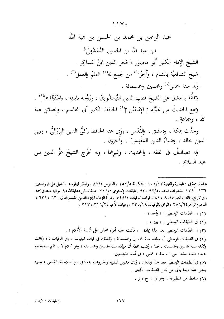 1170 - عبد الرَّحْمَن بن مُحَمَّد بن الْحسن بن هبة الله ابْن عبد الله بن الْحُسَيْن الدِّمَشْقِي