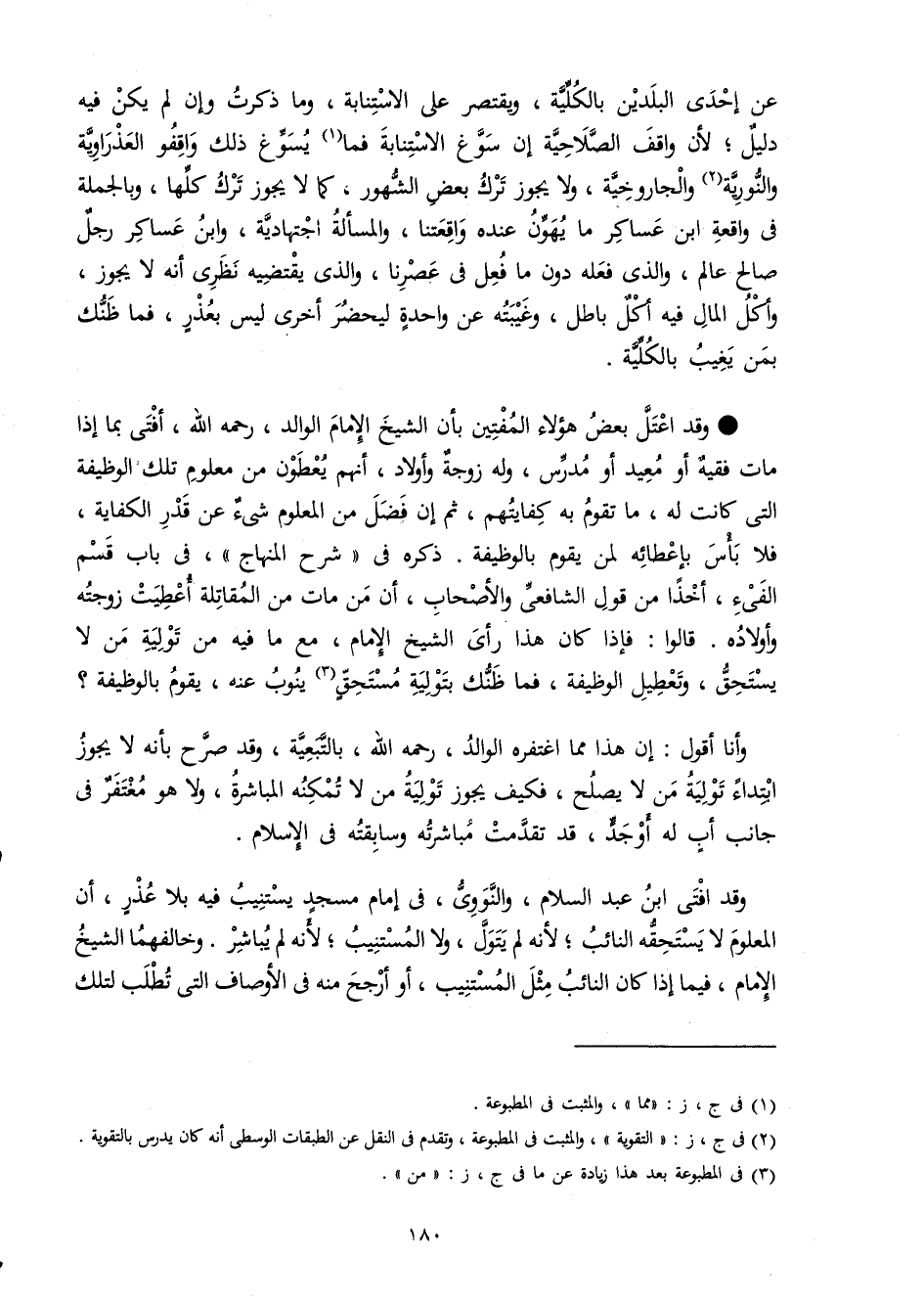 وَقد أفتى ابْن عبد السَّلَام وَالنَّوَوِيّ فِي إِمَام مَسْجِد يَسْتَنِيب فِيهِ بِلَا عذر أَن الْمَعْلُوم لَا يسْتَحقّهُ النَّائِب لِأَنَّهُ لم يتول وَلَا المستنيب لِأَنَّهُ لم يُبَاشر وَخَالَفَهُمَا الشَّيْخ الإِمَام فِيمَا إِذا كَانَ النَّائِب مثل المستنيب أَو أرجح مِنْهُ فِي الْأَوْصَاف الَّتِي تطلب لتِلْك