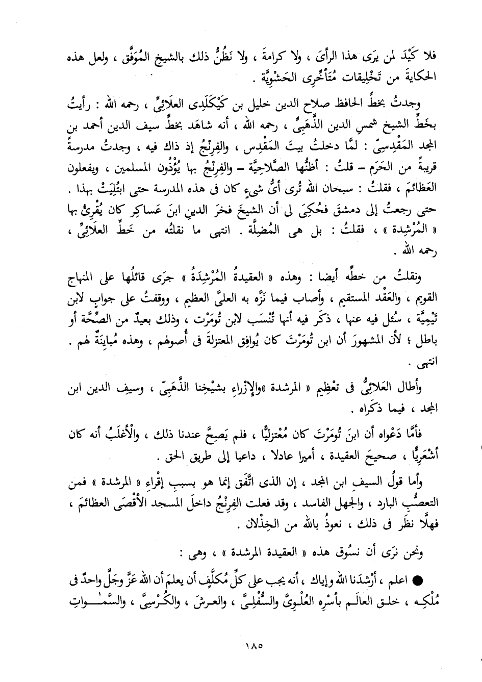 وجدت بِخَط الْحَافِظ صَلَاح الدّين خَلِيل بن كيكلدي العلائي رَحمَه الله رَأَيْت بِخَط الشَّيْخ شمس الدّين الذَّهَبِيّ رَحمَه الله أَنه شَاهد بِخَط سيف الدّين أَحْمد بن الْمجد الْمَقْدِسِي لما دخلت بَيت الْمُقَدّس والفرنج إِذْ ذَاك فِيهِ وجدت مدرسة قريبَة من الْحرم - قلت أظنها الصلاحية - والفرنج بهَا يُؤْذونَ الْمُسلمين ويفعلون العظائم فَقلت سُبْحَانَ الله ترى أَي شَيْء كَانَ فِي هَذِه الْمدرسَة حَتَّى ابْتليت بِهَذَا حَتَّى رجعت إِلَى دمشق فحكي لي أَن الشَّيْخ فَخر الدّين ابْن عَسَاكِر كَا يقرئ بهَا المرشدة فَقلت بل هِيَ المضلة انْتهى مَا نقلته من خطّ العلائي رَحمَه الله