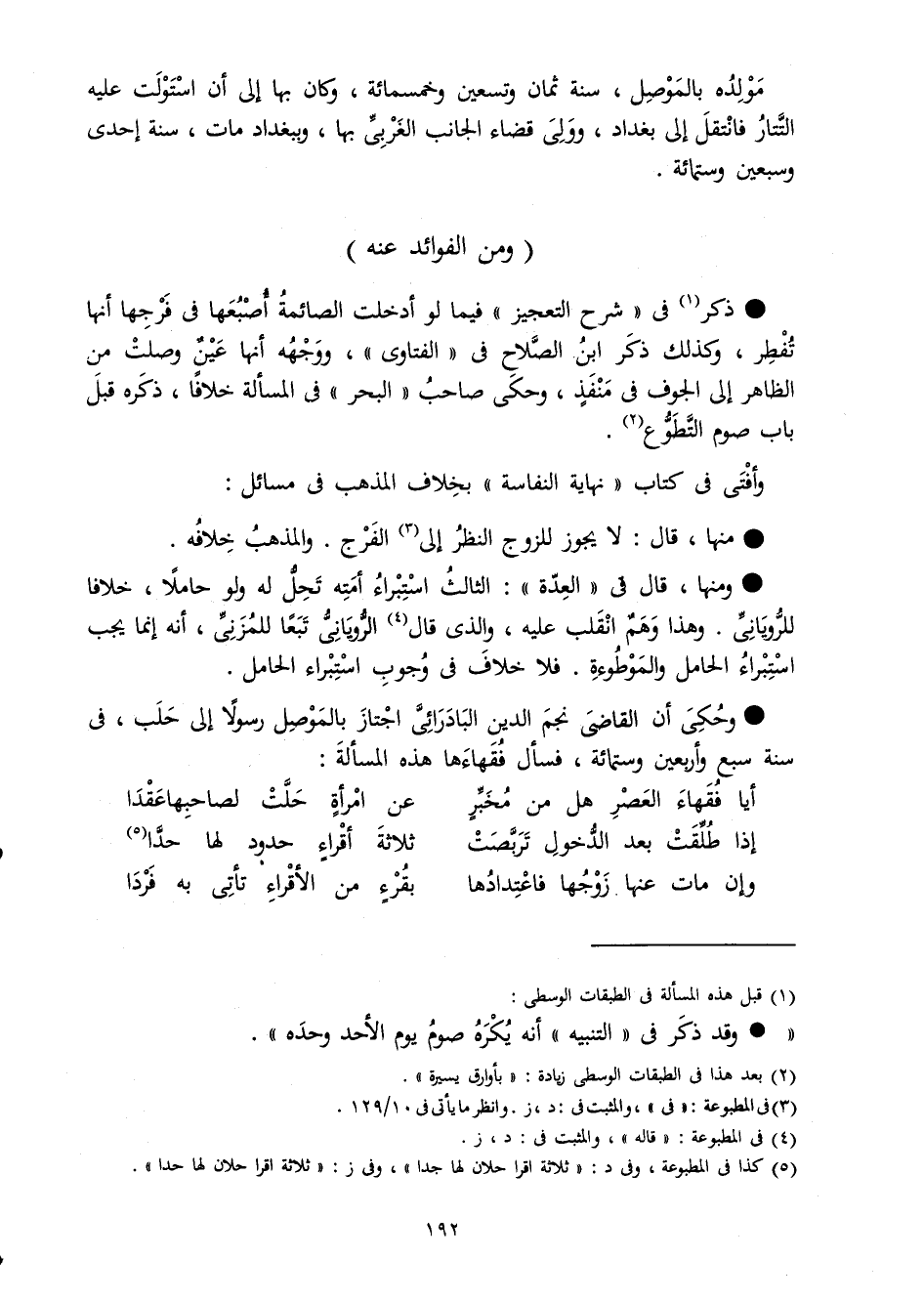 وَحكى أَن القَاضِي نجم الدّين البادرائى اجتاز بالموصل رَسُولا إِلَى حلب فِي سنة سبع وَأَرْبَعين وسِتمِائَة فَسَأَلَ فقهاءها هَذِه الْمَسْأَلَة