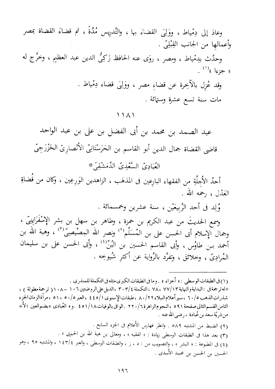 1181 - عبد الصَّمد بن مُحَمَّد بن أبي الْفضل بن عَليّ بن عبد الْوَاحِد قَاضِي الْقُضَاة جمال الدّين أَبُو الْقَاسِم بن الحرستاني الْأنْصَارِيّ الخزرجي الْعَبَّادِيّ السَّعْدِيّ الدِّمَشْقِي