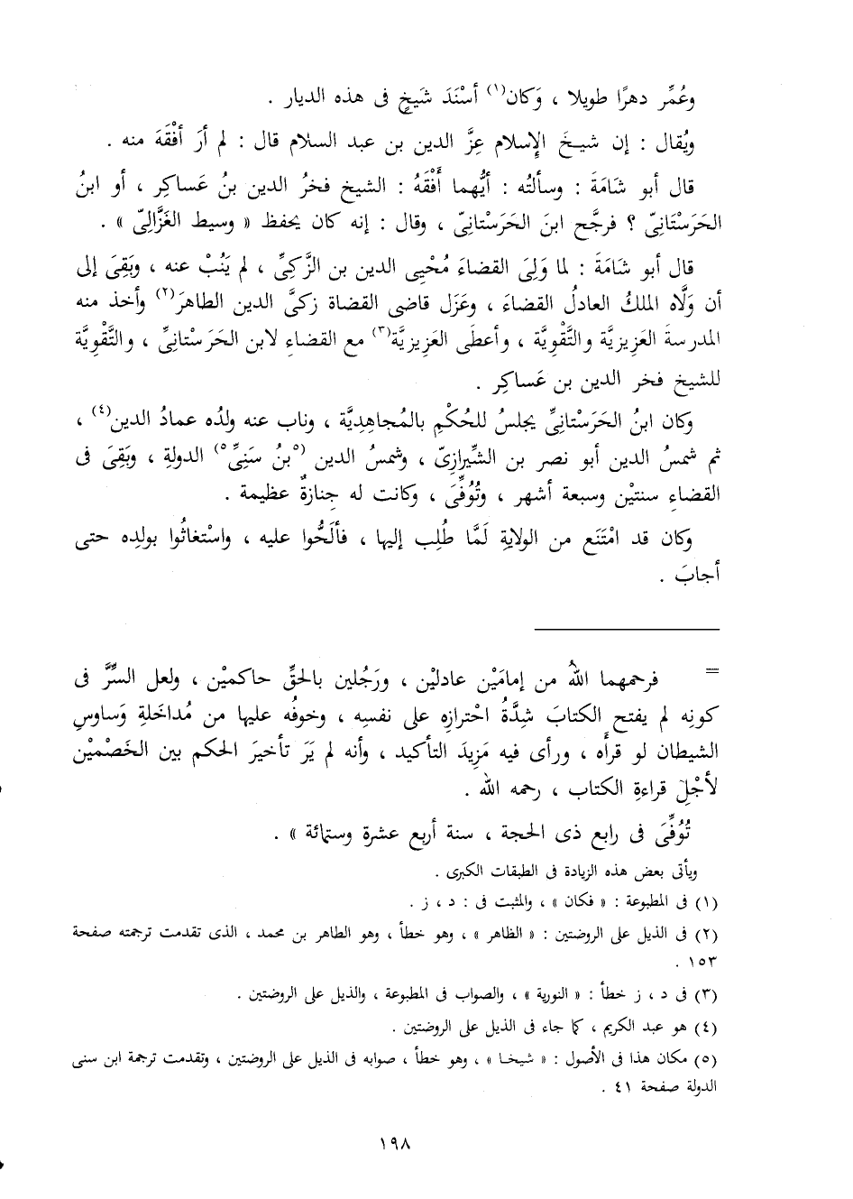 قَالَ أَبُو شامة وَسَأَلته أَيهمَا أفقه الشَّيْخ فَخر الدّين بن عَسَاكِر أَو ابْن الحرستاني فرجح ابْن الحرستاني وَقَالَ إِنَّه كَانَ يحفظ وسيط الْغَزالِيّ