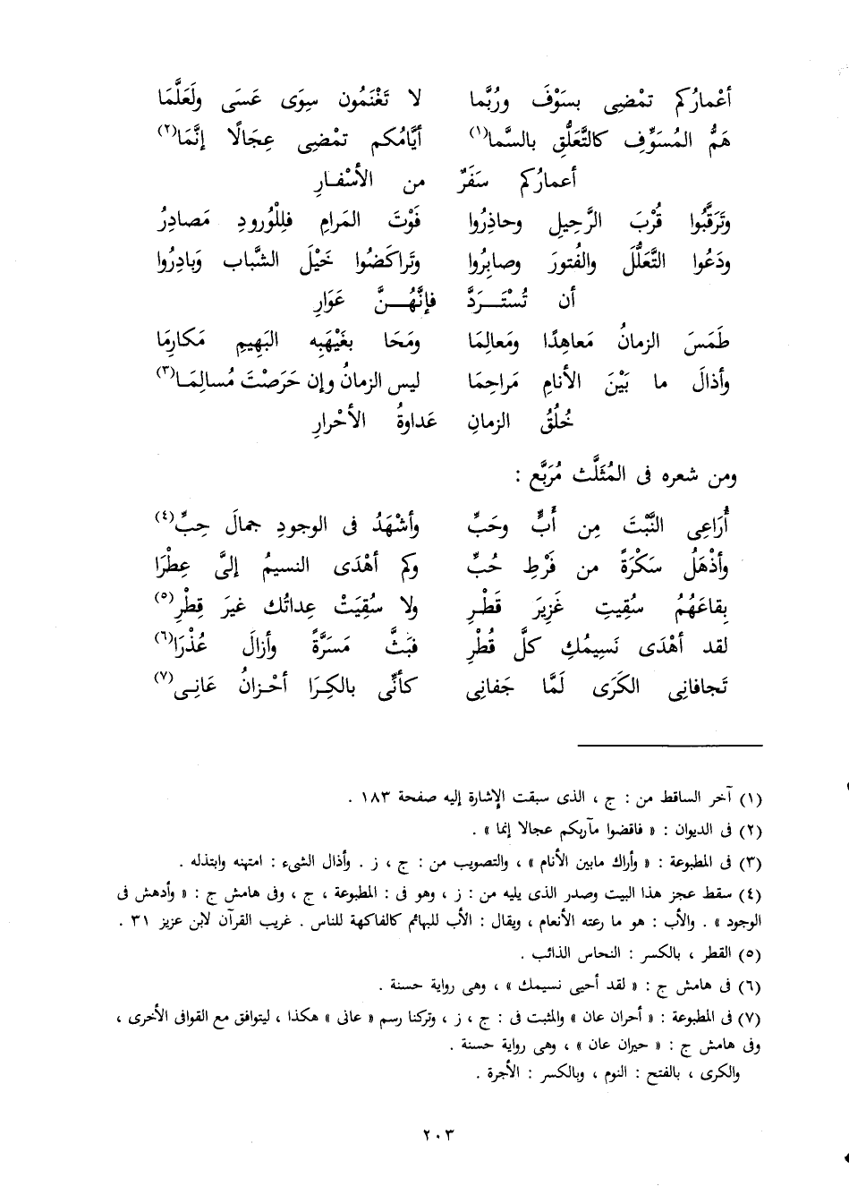 (أعماركم تمْضِي بسوف وَرُبمَا ... لَا تغنمون سوى عَسى ولعلما)