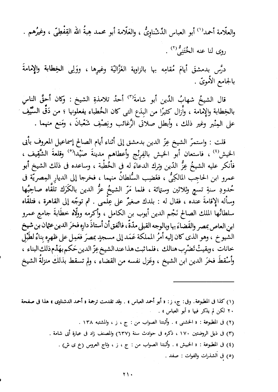 قلت وَاسْتمرّ الشَّيْخ عز الدّين بِدِمَشْق إِلَى أثْنَاء أَيَّام الصَّالح إِسْمَاعِيل الْمَعْرُوف بِأبي الخيش فاستعان أَبُو الخيش بالفرنج وَأَعْطَاهُمْ مَدِينَة صيدا وقلعة الشقيف فَأنْكر عَلَيْهِ الشخ عز الدّين وَترك الدُّعَاء لَهُ فِي الْخطْبَة وساعده فِي ذَلِك الشَّيْخ أَبُو عَمْرو ابْن الْحَاجِب الْمَالِكِي فَغَضب السُّلْطَان مِنْهُمَا فَخَرَجَا إِلَى الديار المصرية فِي حُدُود سنة تسع وَثَلَاثِينَ وسِتمِائَة فَلَمَّا مر الشَّيْخ عز الدّين بالكرك تَلقاهُ صَاحبهَا وَسَأَلَهُ الْإِقَامَة عِنْده فَقَالَ لَهُ بلدك صَغِير على علمي ثمَّ توجه إِلَى الْقَاهِرَة فَتَلقاهُ سلطانها الْملك الصَّالح نجم الدّين أَيُّوب بن الْكَامِل وأكرمه وولاه خطابة جَامع عَمْرو ابْن الْعَاصِ بِمصْر وَالْقَضَاء بهَا وبالوجه القبلي مُدَّة فاتفق أَن أستاذ دَاره فَخر الدّين عُثْمَان بن شيخ الشُّيُوخ وَهُوَ الَّذِي كَانَ إِلَيْهِ أَمر المملكة عمد إِلَى مَسْجِد بِمصْر فَعمل على ظَهره بِنَاء لطبل خانات وَبقيت تضرب هُنَالك فَلَمَّا ثَبت هَذَا عِنْد الشَّيْخ عز الدّين حكم بهدم ذَلِك الْبناء وَأسْقط فَخر الدّين ابْن الشَّيْخ وعزل نَفسه من الْقَضَاء وَلم تسْقط بذلك منزلَة الشَّيْخ