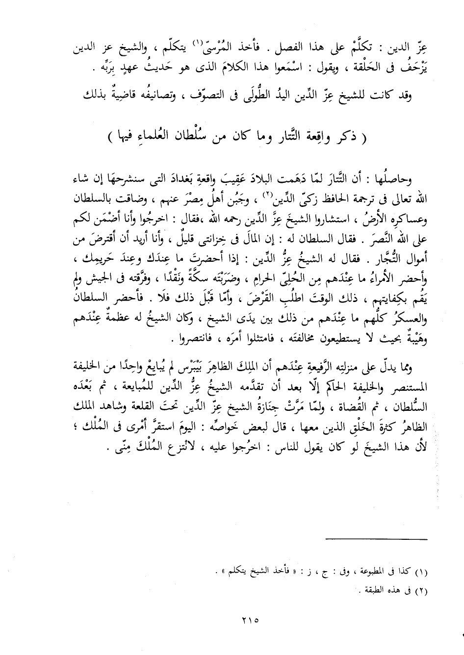 وحاصلها أَن التتار لما دهمت الْبِلَاد عقيب وَاقعَة بَغْدَاد الَّتِي سنشرحها إِن شَاءَ الله تَعَالَى فِي تَرْجَمَة الْحَافِظ زكي الدّين وَجبن أهل مصر عَنْهُم وَضَاقَتْ بالسلطان وعساكره الأَرْض استشاروا الشَّيْخ عز الدّين رَحمَه الله فَقَالَ اخْرُجُوا وَأَنا أضمن لكم على الله النَّصْر فَقَالَ السُّلْطَان لَهُ إِن المَال فِي خزانتي قَلِيل وَأَنا أُرِيد أَن أقترض من أَمْوَال التُّجَّار فَقَالَ لَهُ الشَّيْخ عز الدّين إِذا أحضرت مَا عنْدك وَعند حريمك وأحضر الْأُمَرَاء مَا عِنْدهم من الْحلِيّ الْحَرَام وضربته سكَّة ونقدا وفرقته فِي الْجَيْش وَلم يقم بكفايتهم ذَلِك الْوَقْت اطلب الْقَرْض وَأما قبل ذَلِك فَلَا فأحضر السُّلْطَان والعسكر كلهم مَا عِنْدهم من ذَلِك بَين يَدي الشَّيْخ وَكَانَ الشَّيْخ لَهُ عَظمَة عِنْدهم وهيبة بِحَيْثُ لَا يَسْتَطِيعُونَ مُخَالفَته فامتثلوا أمره فانتصروا