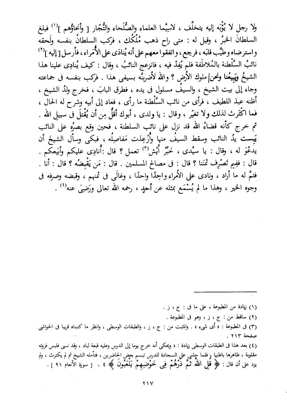 وَلَا رجل لَا يؤبه إِلَيْهِ يتَخَلَّف لَا سِيمَا الْعلمَاء والصلحاء والتجار وأنحاؤهم فَبلغ السُّلْطَان الْخَبَر وَقيل لَهُ مَتى رَاح ذهب ملكك فَركب السُّلْطَان بِنَفسِهِ ولحقه واسترضاه وَطيب قلبه فَرجع وَاتَّفَقُوا مَعَهم على أَنه يُنَادى على الْأُمَرَاء فَأرْسل إِلَيْهِ نَائِب السلطنة بالملاطفة فَلم يفد فِيهِ فانزعج النَّائِب وَقَالَ كَيفَ يُنَادي علينا هَذَا الشَّيْخ ويبيعنا وَنحن مُلُوك الأَرْض وَالله لأضربنه بسيفي هَذَا فَركب بِنَفسِهِ فِي جماعته وَجَاء إِلَى بَيت الشَّيْخ وَالسيف مسلول فِي يَده فطرق الْبَاب فَخرج ولد الشَّيْخ أَظُنهُ عبد اللَّطِيف فَرَأى من نَائِب السلطنة مَا رأى فَعَاد إِلَى أَبِيه وَشرح لَهُ الْحَال فَمَا اكترث لذَلِك وَلَا تغير وَقَالَ يَا وَلَدي أَبوك أقل من أَن يقتل فِي سَبِيل الله ثمَّ خرج كَأَنَّهُ قَضَاء الله قد نزل على نَائِب السلطنة فحين وَقع بَصَره على النَّائِب يَبِسَتْ يَد النَّائِب وَسقط السَّيْف مِنْهَا وأرعدت مفاصله فَبكى وَسَأَلَ الشَّيْخ أَن يَدْعُو لَهُ وَقَالَ يَا سَيِّدي خبر أيش تعْمل قَالَ أنادي عَلَيْكُم وأبيعكم قَالَ فَفِيمَ تصرف ثمننا قَالَ فِي مصَالح الْمُسلمين قَالَ من يقبضهُ قَالَ أَنا فتم لَهُ مَا أَرَادَ ونادى على الْأُمَرَاء وَاحِدًا وَاحِدًا وغالى فِي ثمنهم وَقَبضه وَصَرفه فِي وُجُوه الْخَيْر وَهَذَا مَا لم يسمع بِمثلِهِ عَن أحد رَحمَه الله تَعَالَى ورضى عَنهُ
