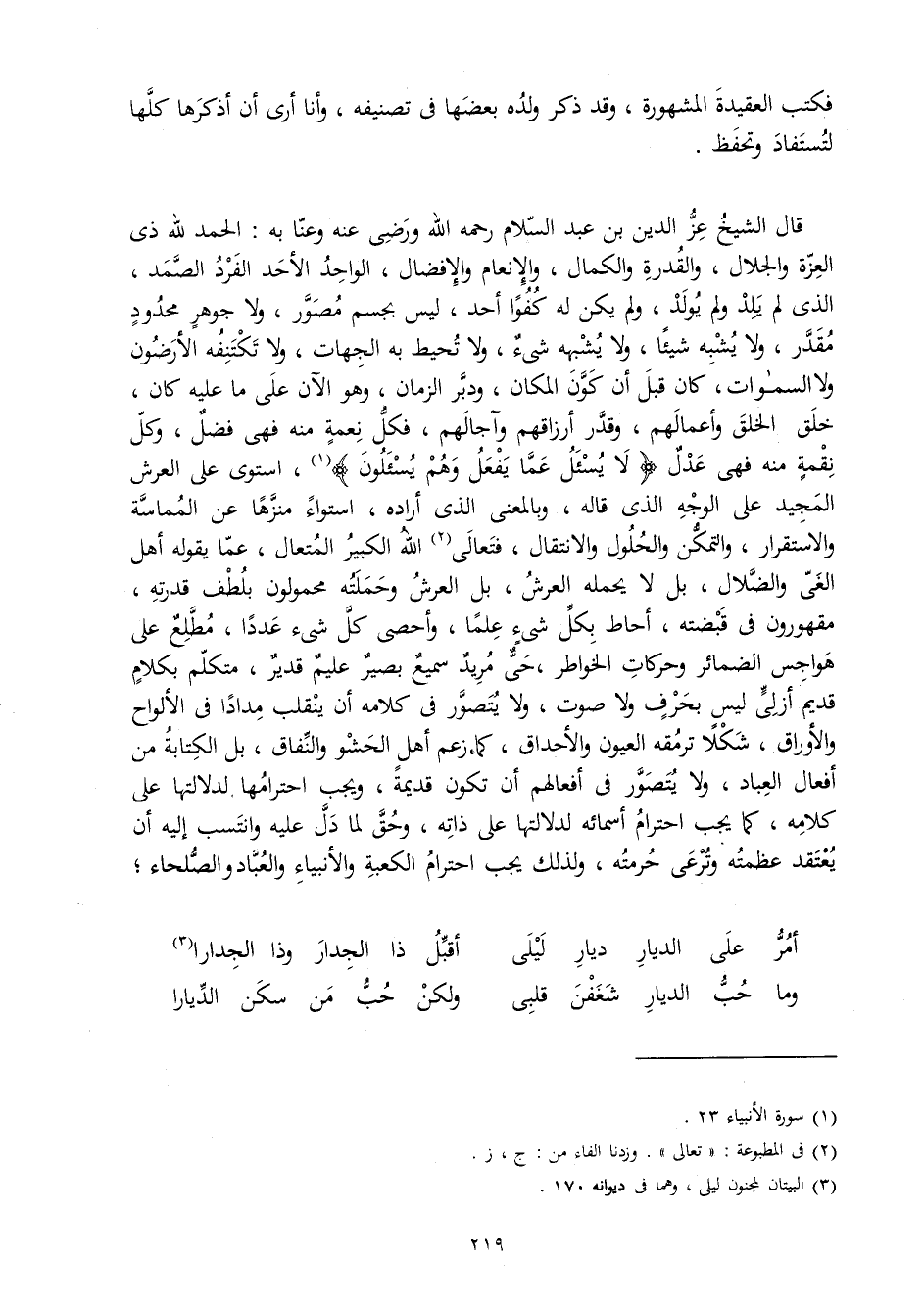قَالَ الشَّيْخ عز الدّين بن عبد السَّلَام رَحمَه الله وَرَضي عَنهُ وعنا بِهِ الْحَمد لله ذِي الْعِزَّة والجلال وَالْقُدْرَة والكمال والإنعام والإفضال الْوَاحِد الْأَحَد الْفَرد الصَّمد الَّذِي لم يلد وَلم يُولد وَلم يكن لَهُ كفوا أحد لَيْسَ بجسم مُصَور وَلَا جَوْهَر مَحْدُود مُقَدّر وَلَا يشبه شَيْئا وَلَا يُشبههُ شَيْء وَلَا تحيط بِهِ الْجِهَات وَلَا تكتنفه الأرضون وَلَا السَّمَوَات كَانَ قبل أَن كَون الْمَكَان ودبر الزَّمَان وَهُوَ الْآن على مَا عَلَيْهِ كَانَ خلق الْخلق وأعمالهم وَقدر أَرْزَاقهم وآجالهم فَكل نعْمَة مِنْهُ فَهِيَ فضل وكل نقمة مِنْهُ فَهِيَ عدل {لَا يسْأَل عَمَّا يفعل وهم يسْأَلُون} اسْتَوَى على الْعَرْش الْمجِيد على الْوَجْه الَّذِي قَالَه وبالمعنى الَّذِي أَرَادَهُ اسْتِوَاء منزها عَن المماسة والاستقرار والتمكن والحلول والانتقال فتعالى الله الْكَبِير المتعال عَمَّا يَقُوله أهل الغي والضلال بل لَا يحملهُ الْعَرْش بل الْعَرْش وَحَمَلته محمولون بلطف قدرته مقهورون فِي قَبضته أحَاط بِكُل شَيْء علما وأحصى كل شَيْء عددا مطلع على هواجس الضمائر وحركات الخواطر حَيّ مُرِيد سميع بَصِير عليم قدير مُتَكَلم بِكَلَام قديم أزلي لَيْسَ بِحرف وَلَا صَوت وَلَا يتَصَوَّر فِي كَلَامه أَن يَنْقَلِب مدادا فِي الألواح والأوراق شكلا ترمقه الْعُيُون والأحداق كَمَا زعم أهل الحشو والنفاق بل الْكِتَابَة من أَفعَال الْعباد وَلَا يتَصَوَّر فِي أفعالهم أَن تكون قديمَة وَيجب احترامها لدلالتها على كَلَامه كَمَا يجب احترام أَسْمَائِهِ لدلالتها على ذَاته وَحقّ لما دلّ عَلَيْهِ وانتسب إِلَيْهِ أَن يعْتَقد عَظمته وترعى حرمته وَلذَلِك يجب احترام الْكَعْبَة والأنبياء والعباد والصلحاء