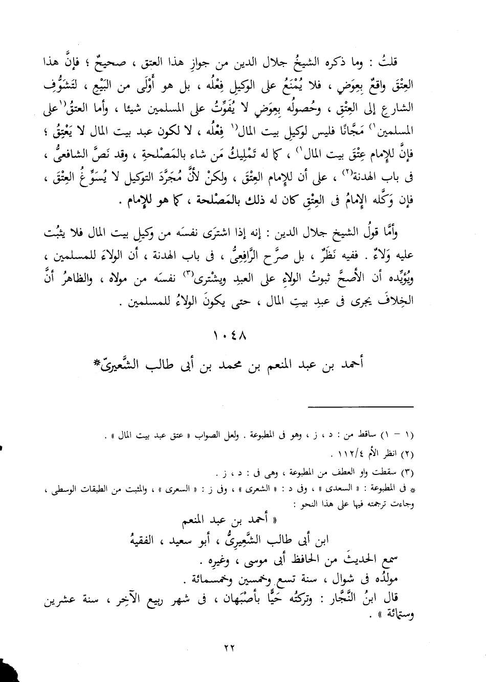قلت وَمَا ذكره الشَّيْخ جلال الدّين من جَوَاز هَذَا الْعتْق صَحِيح فَإِن هَذَا الْعتْق وَاقع بعوض فَلَا يمْنَع على الْوَكِيل فعله بل هُوَ أولى من البيع لتشوف الشَّارِع إِلَى الْعتْق وحصوله بعوض لَا يفوت على الْمُسلمين شَيْئا وَأما الْعتْق على الْمُسلمين مجَّانا فَلَيْسَ لوكيل بَيت المَال فعله لَا لكَون عبد بَيت المَال لَا يعْتق فَإِن للْإِمَام عتق بَيت المَال كَمَا لَهُ تمْلِيك من شَاءَ بِالْمَصْلَحَةِ وَقد نَص الشَّافِعِي فِي بَاب الْهُدْنَة على أَن للْإِمَام الْعتْق وَلَكِن لِأَن مُجَرّد التَّوْكِيل لَا يسوغ الْعتْق فَإِن وَكله الإِمَام فِي الْعتْق كَانَ لَهُ ذَلِك بِالْمَصْلَحَةِ كَمَا هُوَ للْإِمَام