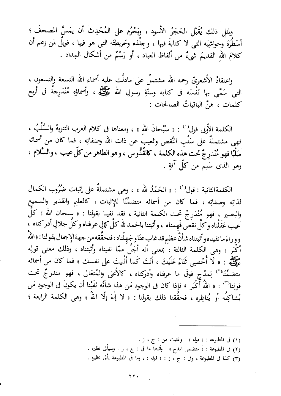 واعتقاد الْأَشْعَرِيّ رَحمَه الله مُشْتَمل على مَا دلّت عَلَيْهِ أَسمَاء الله التِّسْعَة وَالتِّسْعُونَ الَّتِي سمى بهَا نَفسه فِي كِتَابه وسنه رَسُول الله صلى الله عَلَيْهِ وَسلم وأسماؤه مندرجة فِي أَربع كَلِمَات هن الْبَاقِيَات الصَّالِحَات
