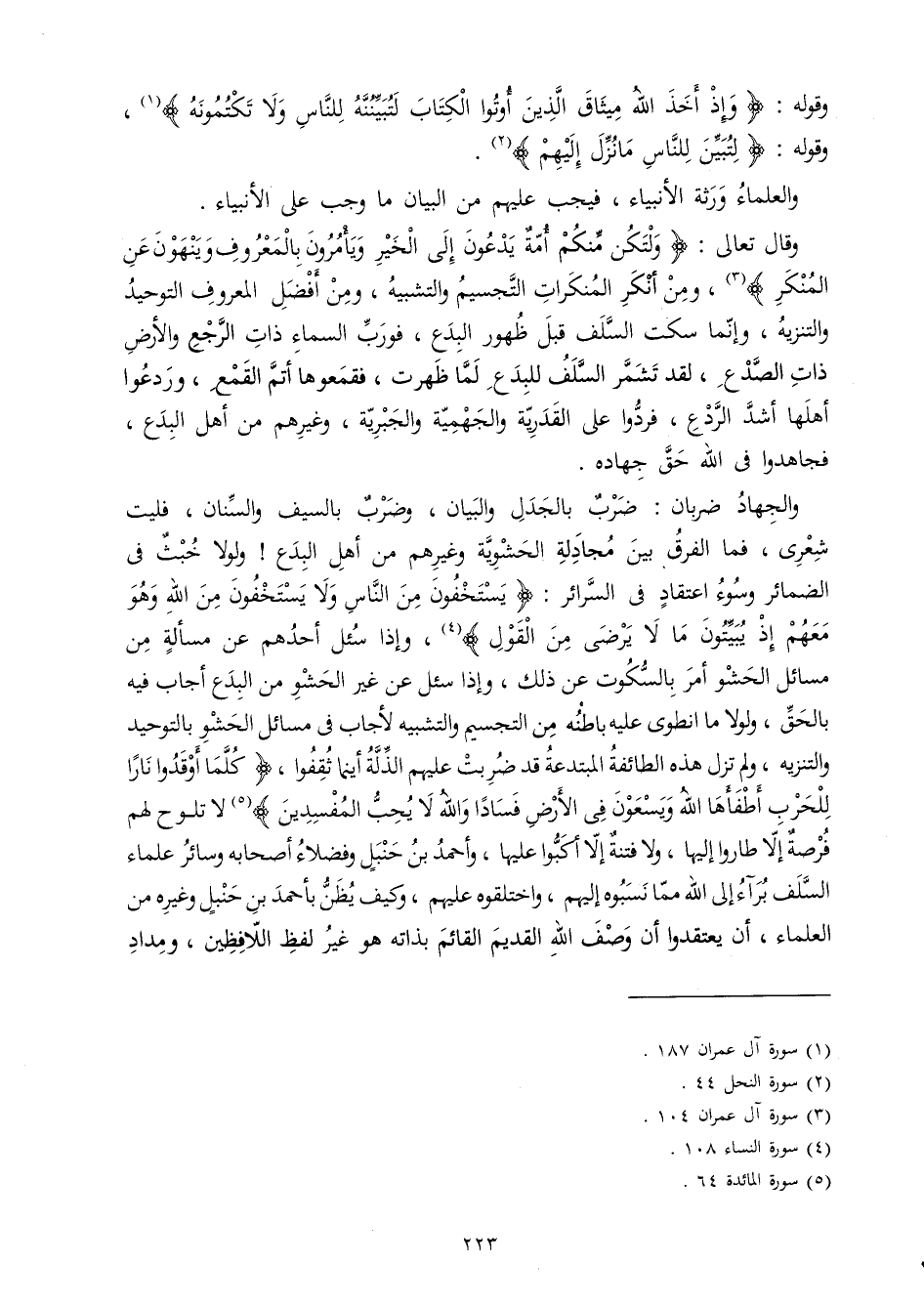 وَقَالَ تَعَالَى {ولتكن مِنْكُم أمة يدعونَ إِلَى الْخَيْر ويأمرون بِالْمَعْرُوفِ وَينْهَوْنَ عَن الْمُنكر} وَمن أنكر الْمُنْكَرَات التجسيم والتشبيه وَمن أفضل الْمَعْرُوف التَّوْحِيد والتنزيه وَإِنَّمَا سكت السّلف قبل ظُهُور الْبدع فَوَرَبِّ السَّمَاء ذَات الرجع وَالْأَرْض ذَات الصدع لقد تشمر السّلف للبدع لما ظَهرت فقمعوها أتم القمع وردعوا أَهلهَا أَشد الردع فَردُّوا على الْقَدَرِيَّة والجهمية والجبرية وَغَيرهم من أهل الْبدع فجاهدوا فِي الله حق جهاده