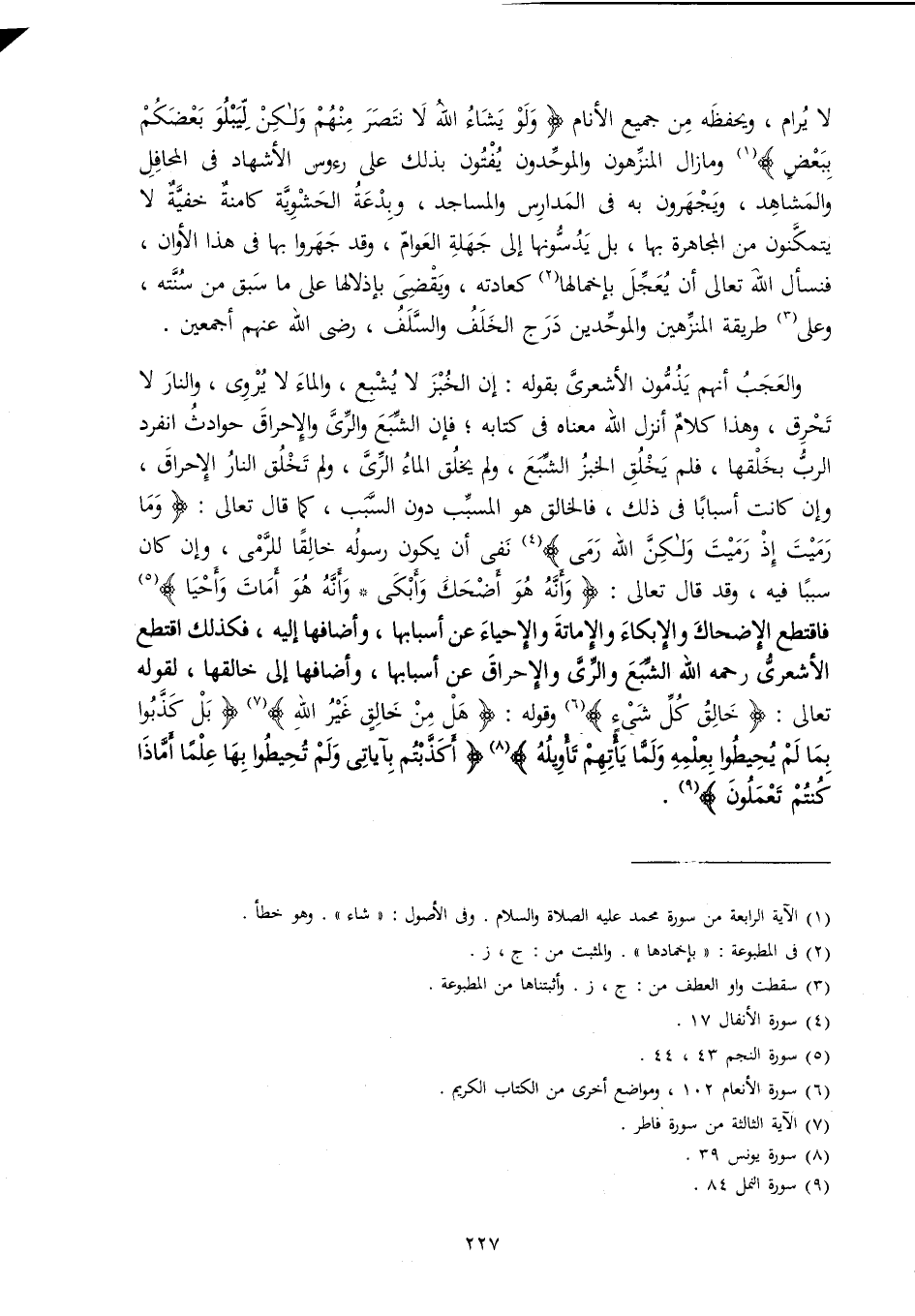 وَالْعجب أَنهم يذمون الْأَشْعَرِيّ بقوله إِن الْخبز لَا يشْبع وَالْمَاء لَا يروي وَالنَّار لَا تحرق وَهَذَا كَلَام أنزل الله مَعْنَاهُ فِي كِتَابه فَإِن الشِّبَع والري والإحراق حوادث انْفَرد الرب بخلقها فَلم يخلق الْخبز الشِّبَع وَلم يخلق المَاء الرّيّ وَلم تخلق النَّار الإحراق وَإِن كَانَت أسبابا فِي ذَلِك فالخالق هُوَ الْمُسَبّب دون السَّبَب كَمَا قَالَ تَعَالَى {وَمَا رميت إِذْ رميت وَلَكِن الله رمى} نفى أَن يكون رَسُوله خَالِقًا للرمى وَإِن كَانَ سَببا فِيهِ وَقد قَالَ تَعَالَى {وَأَنه هُوَ أضْحك وأبكى وَأَنه هُوَ أمات وَأَحْيَا} فاقتطع الإضحاك والإبكاء والإماتة والإحياء عَن أَسبَابهَا وأضافها إِلَيْهِ فَكَذَلِك اقتطع الْأَشْعَرِيّ رَحمَه الله الشِّبَع والري والإحراق عَن أَسبَابهَا وأضافها إِلَى خَالِقهَا لقَوْله تَعَالَى {خَالق كل شَيْء} وَقَوله {هَل من خَالق غير الله} {بل كذبُوا بِمَا لم يحيطوا بِعِلْمِهِ وَلما يَأْتهمْ تَأْوِيله} {أكذبتم بآياتي وَلم تحيطوا بهَا علما أم مَاذَا كُنْتُم تَعْمَلُونَ}