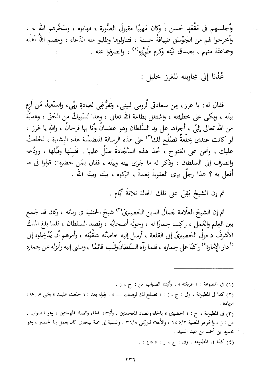 ثمَّ إِن الشَّيْخ الْعَلامَة جمال الدّين الحصيري شيخ الْحَنَفِيَّة فِي زَمَانه وَكَانَ قد جمع بَين الْعلم وَالْعَمَل ركب حمارا لَهُ وَحَوله أَصْحَابه وَقصد السُّلْطَان فَلَمَّا بلغ الْملك الْأَشْرَف دُخُول الحصيري إِلَى القلعة أرسل إِلَيْهِ خاصته يتلقونه وَأمرهمْ أَن يدخلوه إِلَى دَار الْإِمَارَة رَاكِبًا على حِمَاره فَلَمَّا رَآهُ السُّلْطَان وثب قَائِما وَمَشى إِلَيْهِ وأنزله عَن حِمَاره