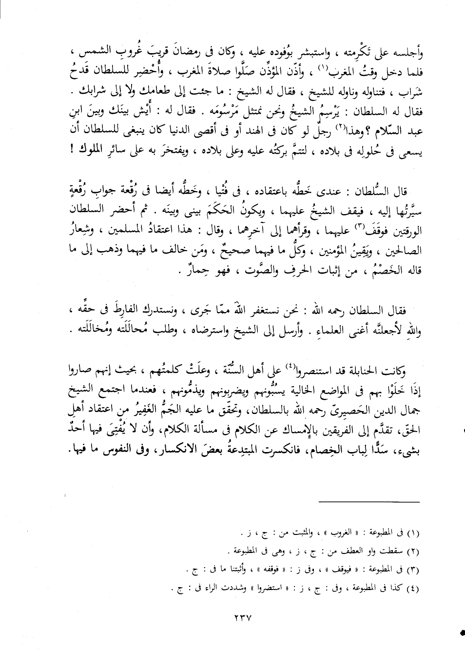 وَكَانَت الْحَنَابِلَة قد استنصروا على أهل السّنة وعلت كلمتهم بِحَيْثُ إِنَّهُم صَارُوا إِذا خلوا بهم فِي الْمَوَاضِع الخالية يسبونهم ويضربونهم ويذمونهم فعندما اجْتمع الشَّيْخ جمال الدّين الحصيري رَحمَه الله بالسلطان وَتحقّق مَا عَلَيْهِ الجم الْغَفِير من اعْتِقَاد أهل الْحق تقدم إِلَى الْفَرِيقَيْنِ بالإمساك عَن الْكَلَام فِي مَسْأَلَة الْكَلَام وَأَن لَا يُفْتِي فِيهَا أحد بِشَيْء سدا لباب الْخِصَام فَانْكَسَرت المبتدعة بعض الانكسار وَفِي النُّفُوس مَا فِيهَا