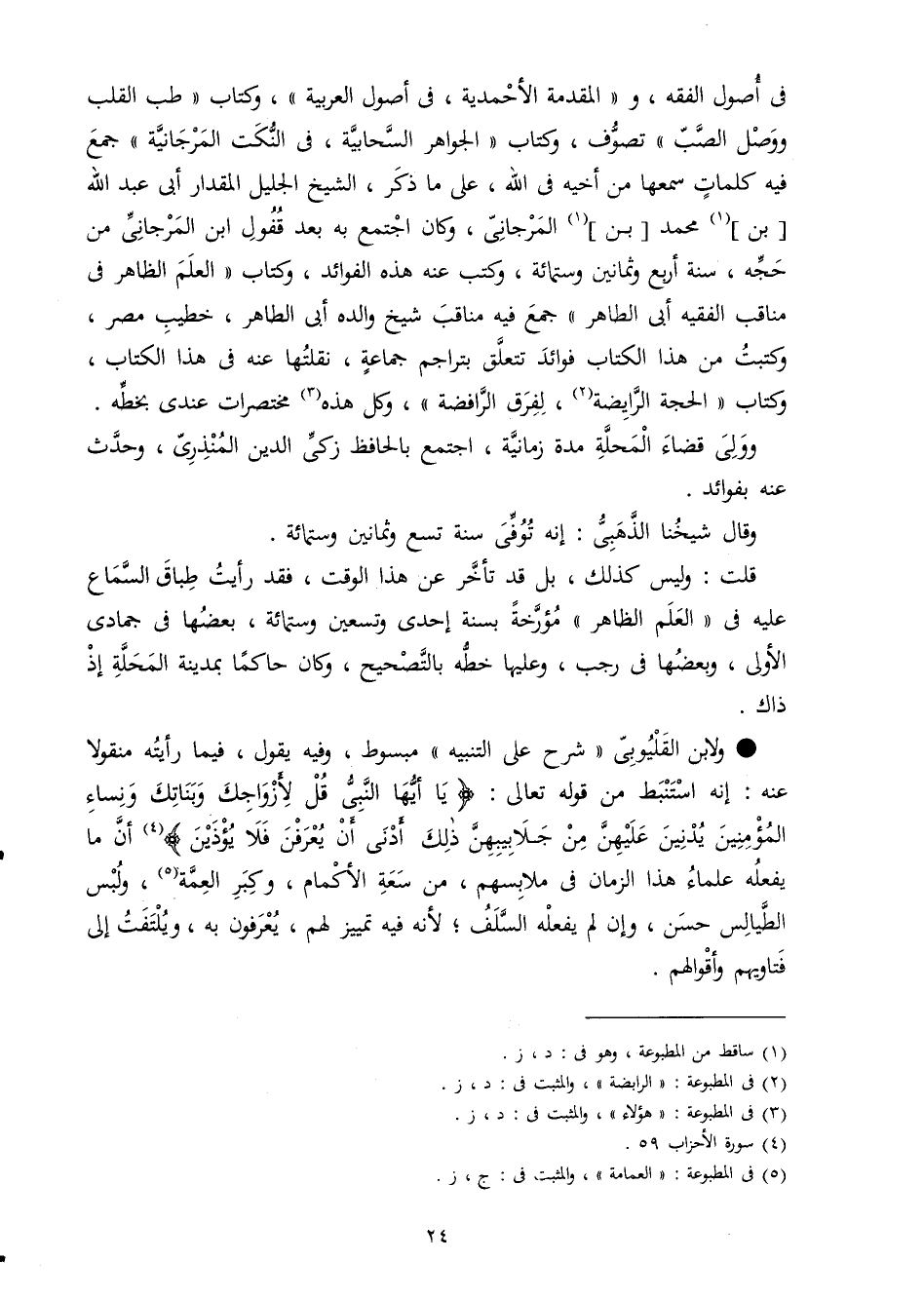 وَلابْن القليوبي شرح على التَّنْبِيه مَبْسُوط وَفِيه يَقُول فِيمَا رَأَيْته مَنْقُولًا عَنهُ إِنَّه استنبط من قَوْله تَعَالَى {يَا أَيهَا النَّبِي قل لِأَزْوَاجِك وبناتك وَنسَاء الْمُؤمنِينَ يدنين عَلَيْهِنَّ من جلابيبهن ذَلِك أدنى أَن يعرفن فَلَا يؤذين} أَن مَا يَفْعَله عُلَمَاء هَذَا الزَّمَان فِي ملابسهم من سَعَة الأكمام وَكبر الْعمة وَلبس الطيالس حسن وَإِن لم يَفْعَله السّلف لِأَنَّهُ فِيهِ تَمْيِيز لَهُم يعْرفُونَ بِهِ ويلتفت إِلَى فتاويهم وأقوالهم