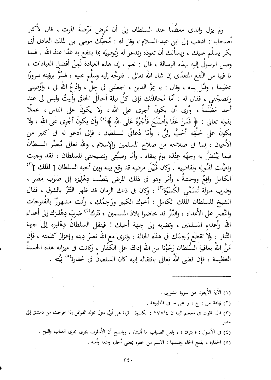 وَلم يزل وَالِدي مُعظما عِنْد السُّلْطَان إِلَى أَن مرض مرضة الْمَوْت قَالَ لأكبر أَصْحَابه اذْهَبْ إِلَى ابْن عبد السَّلَام وَقل لَهُ محبك مُوسَى ابْن الْملك الْعَادِل أبي بكر يسلم عَلَيْك ويسألك أَن تعوده وَتَدْعُو لَهُ وتوصيه بِمَا ينْتَفع بِهِ غَدا عِنْد الله فَلَمَّا وصل الرَّسُول إِلَيْهِ بِهَذِهِ الرسَالَة قَالَ نعم إِن هَذِه العيادة لمن أفضل الْعِبَادَات لما فِيهَا من النَّفْع الْمُتَعَدِّي إِن شَاءَ الله تَعَالَى فَتوجه إِلَيْهِ وَسلم عَلَيْهِ فسر بِرُؤْيَتِهِ سُرُورًا عَظِيما وَقبل يَده وَقَالَ يَا عز الدّين اجْعَلنِي فِي حل وادع الله لي وأوصني وانصحني فَقَالَ لَهُ أما محاللتك فَإِنِّي كل لَيْلَة أحالل الْخلق وأبيت وَلَيْسَ لي عِنْد أحد مظْلمَة وَأرى أَن يكون أجري على الله وَلَا يكون على النَّاس عملا بقوله تَعَالَى {فَمن عَفا وَأصْلح فَأَجره على الله} وَأَن يكون أجري على الله وَلَا يكون على خلقه أحب إِلَيّ وَأما دعائي للسُّلْطَان فَإِنِّي أَدْعُو لَهُ فِي كثير من الأحيان لما فِي صَلَاحه من صَلَاح الْمُسلمين وَالْإِسْلَام وَالله تَعَالَى يبصر السُّلْطَان فِيمَا يبيض بِهِ وَجهه عِنْده يَوْم يلقاه وَأما وصيتي ونصيحتي للسُّلْطَان فقد وَجَبت وتعينت لقبوله وتقاضيه وَكَانَ قبيل مَرضه قد وَقع بَينه وَبَين أَخِيه السُّلْطَان الْملك الْكَامِل وَاقع ووحشة وَأمر وَهُوَ فِي ذَلِك الْمَرَض بِنصب دهليزه إِلَى صوب مصر وَضرب منزلَة تسمى الْكسْوَة وَكَانَ فِي ذَلِك الزَّمَان قد ظهر التتر بالشرق فَقَالَ الشَّيْخ للسُّلْطَان الْملك الْكَامِل أَخُوك الْكَبِير ورحمك وَأَنت مَشْهُور بالفتوحات والنصر على الْأَعْدَاء والتتر قد خَاضُوا بِلَاد الْمُسلمين تتْرك ضرب دهليزك إِلَى أَعدَاء الله وأعداء الْمُسلمين وتضربه إِلَى جِهَة أَخِيك فينقل السُّلْطَان دهليزه إِلَى جِهَة التتار وَلَا تقطع رَحِمك فِي هَذِه الْحَالة وتنوي مَعَ الله نصر دينه وإعزاز كَلمته فَإِن من الله بعافية السُّلْطَان رجونا من الله إدالته على الْكفَّار وَكَانَت فِي مِيزَانه هَذِه الْحَسَنَة الْعَظِيمَة فَإِن قضى الله تَعَالَى بانتقاله إِلَيْهِ كَانَ السُّلْطَان فِي خفارة نِيَّته