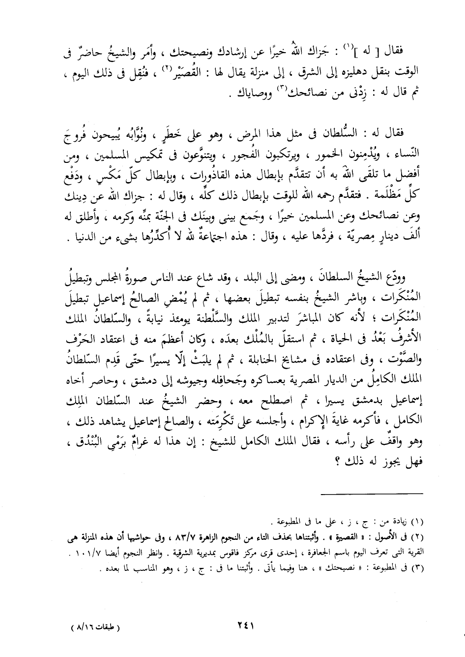 فَقَالَ لَهُ السُّلْطَان فِي مثل هَذَا الْمَرَض وَهُوَ على خطر ونوابه يبيحون فروج النِّسَاء ويدمنون الْخُمُور ويرتكبون الْفُجُور ويتنوعون فِي تمكيس الْمُسلمين وَمن أفضل مَا تلقى الله بِهِ أَن تتقدم بِإِبْطَال هَذِه القاذورات وبإبطال كل مكس وَدفع كل مظْلمَة فَتقدم رَحمَه الله للْوَقْت بِإِبْطَال ذَلِك كُله وَقَالَ لَهُ جَزَاك الله عَن دينك وَعَن نصائحك وَعَن الْمُسلمين خيرا وَجمع بيني وَبَيْنك فِي الْجنَّة بمنه وَكَرمه وَأطلق لَهُ ألف دِينَار مصرية فَردهَا عَلَيْهِ وَقَالَ هَذِه اجتماعة لله لَا أكدرها بِشَيْء من الدُّنْيَا