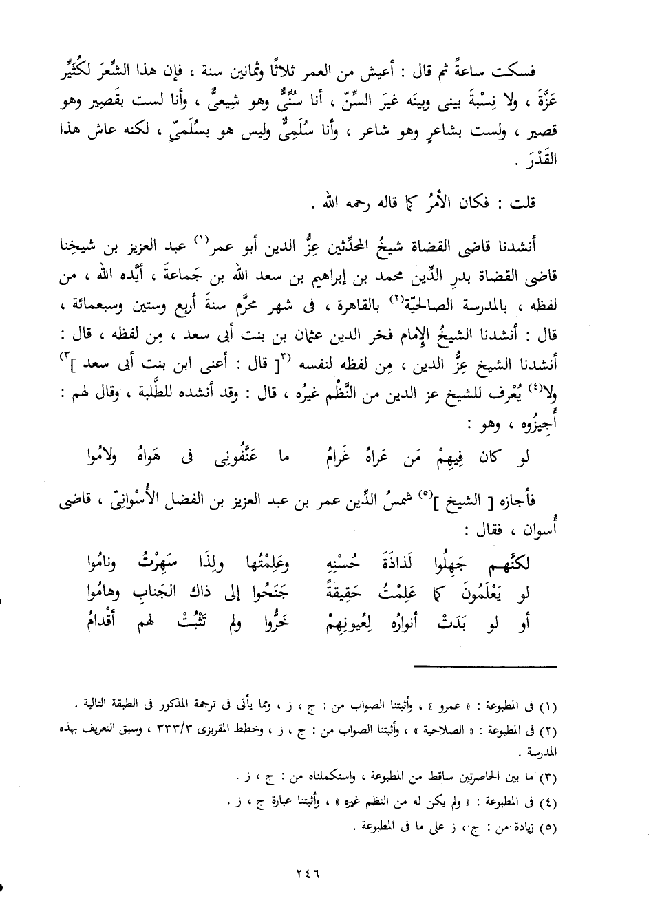 أنشدنا قَاضِي الْقُضَاة شيخ الْمُحدثين عز الدّين أَبُو عمر عبد الْعَزِيز بن شَيخنَا قَاضِي الْقُضَاة بدر الدّين مُحَمَّد بن إِبْرَاهِيم بن سعد الله بن جمَاعَة أيده الله من لَفظه بِالْمَدْرَسَةِ الصالحية بِالْقَاهِرَةِ فِي شهر محرم سنة أَربع وَسِتِّينَ وَسَبْعمائة قَالَ أنشدنا الشَّيْخ الإِمَام فَخر الدّين عُثْمَان بن بنت أبي سعد من لَفظه قَالَ أنشدنا الشَّيْخ عز الدّين من لَفظه لنَفسِهِ قَالَ أَعنِي ابْن بنت أبي سعد وَلَا يعرف للشَّيْخ عز الدّين من النّظم غَيره قَالَ وَقد أنْشدهُ للطلبة وَقَالَ لَهُم أجيزوه وَهُوَ