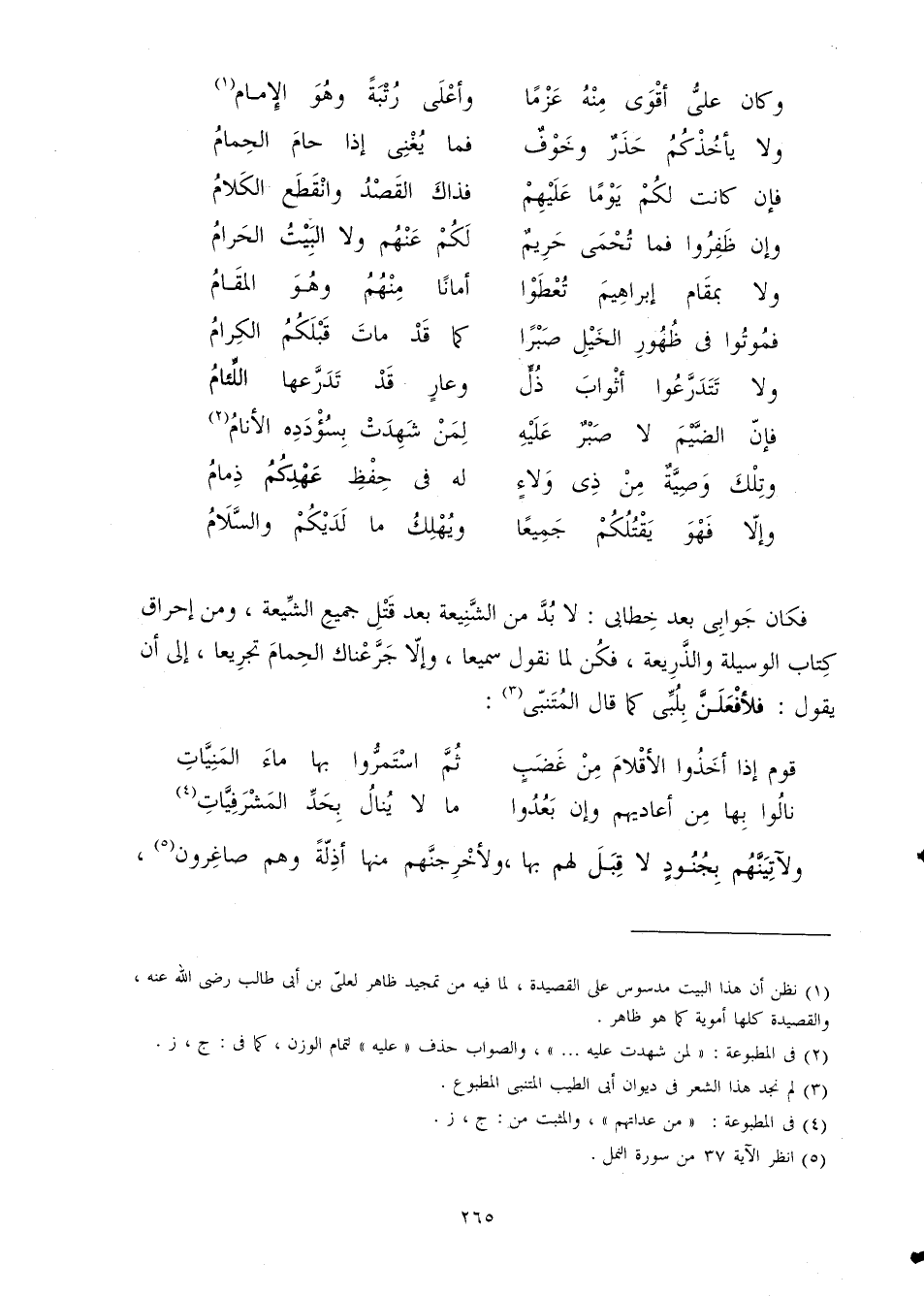 فَكَانَ جوابي بعد خطابي لَا بُد من الشنيعة بعد قتل جَمِيع الشِّيعَة وَمن إحراق كتاب الْوَسِيلَة والذريعة فَكُن لما نقُول سميعا وَإِلَّا جرعناك الْحمام تجريعا إِلَى أَن يَقُول فلأفعلن بلبي كَمَا قَالَ المتنبي
