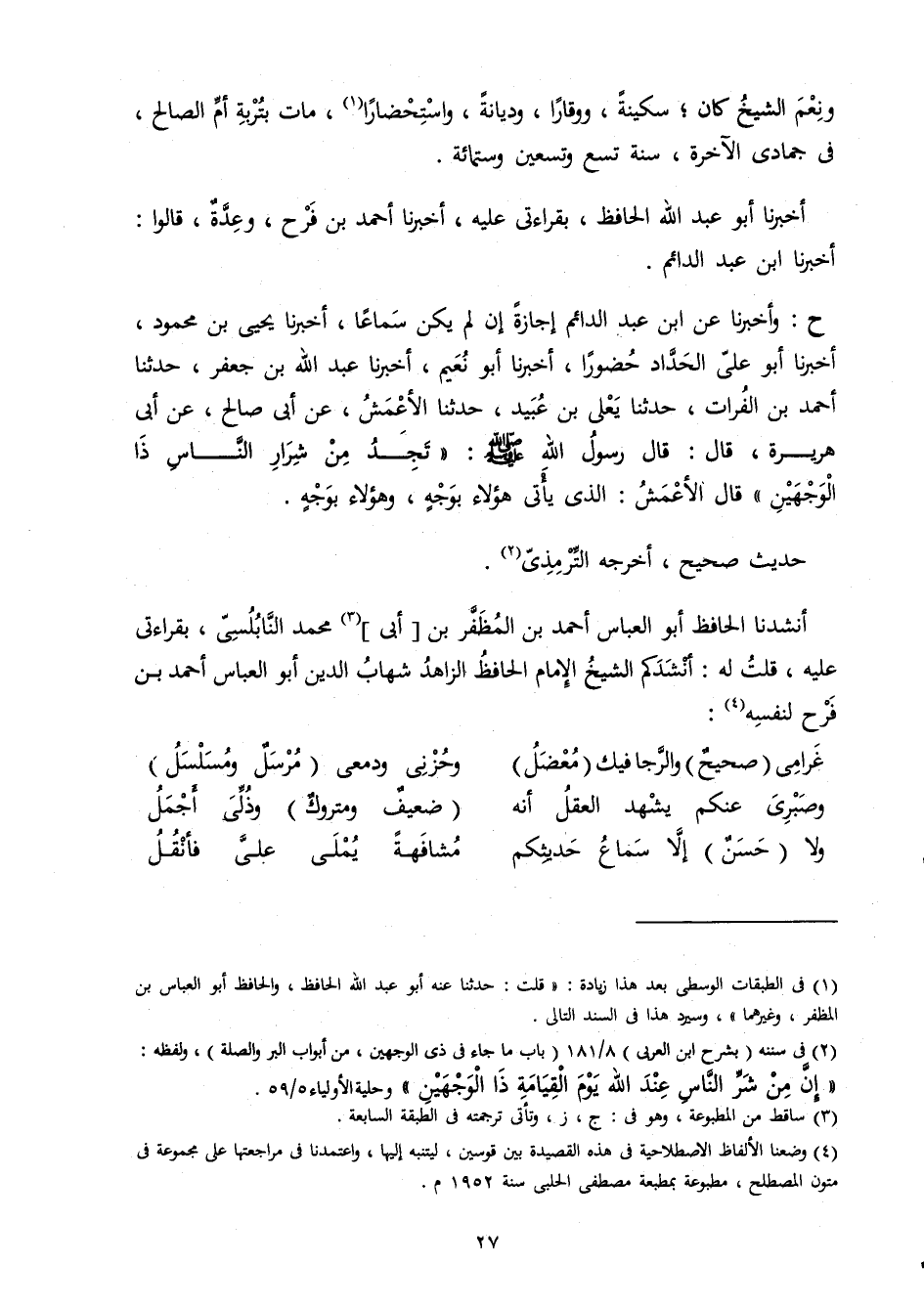 ح وَأخْبرنَا عَن ابْن عبد الدَّائِم إجَازَة إِن لم يكن سَمَاعا أخبرنَا يحيى بن مَحْمُود أخبرنَا أَبُو عَليّ الْحداد حضورا أخبرنَا أَبُو نعيم أخبرنَا عبد الله بن جَعْفَر حَدثنَا أَحْمد بن الْفُرَات حَدثنَا يعلى بن عبيد حَدثنَا الْأَعْمَش عَن أبي صَالح عَن أبي هُرَيْرَة قَالَ قَالَ رَسُول الله صلى الله عَلَيْهِ وَسلم تَجِد من شرار النَّاس ذَا الْوَجْهَيْنِ قَالَ الْأَعْمَش الَّذِي يَأْتِي هَؤُلَاءِ بِوَجْه وَهَؤُلَاء بِوَجْه // حَدِيث صَحِيح // // أخرجه التِّرْمِذِيّ //